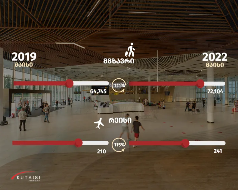 მაისის თვეში ქუთაისის საერთაშორისო აეროპორტში მგზავრთნაკადის 111%, რეისების რაოდენობის კი 115 % აღდგა