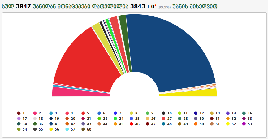 უბნების 99.9%-ში ხმები დათვლილია - „ქართული ოცნება“ 48.15%, „ნაციონალური მოძრაობა” 27.13%