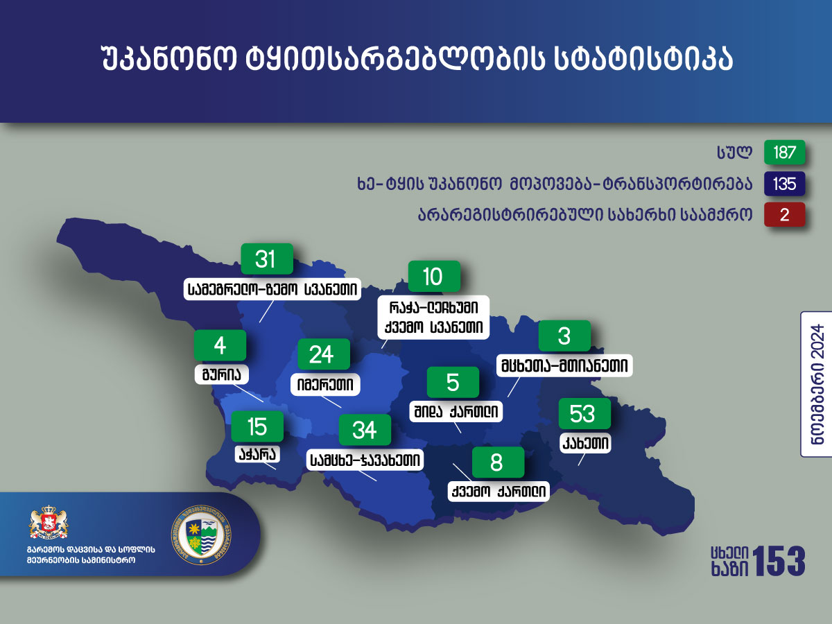 გარემოსდაცვითი ზედამხედველობის დეპარტამენტის თანამშრომლებმა ნოემბერში უკანონო ტყითსარგებლობის 187 ფაქტი გამოავლინეს