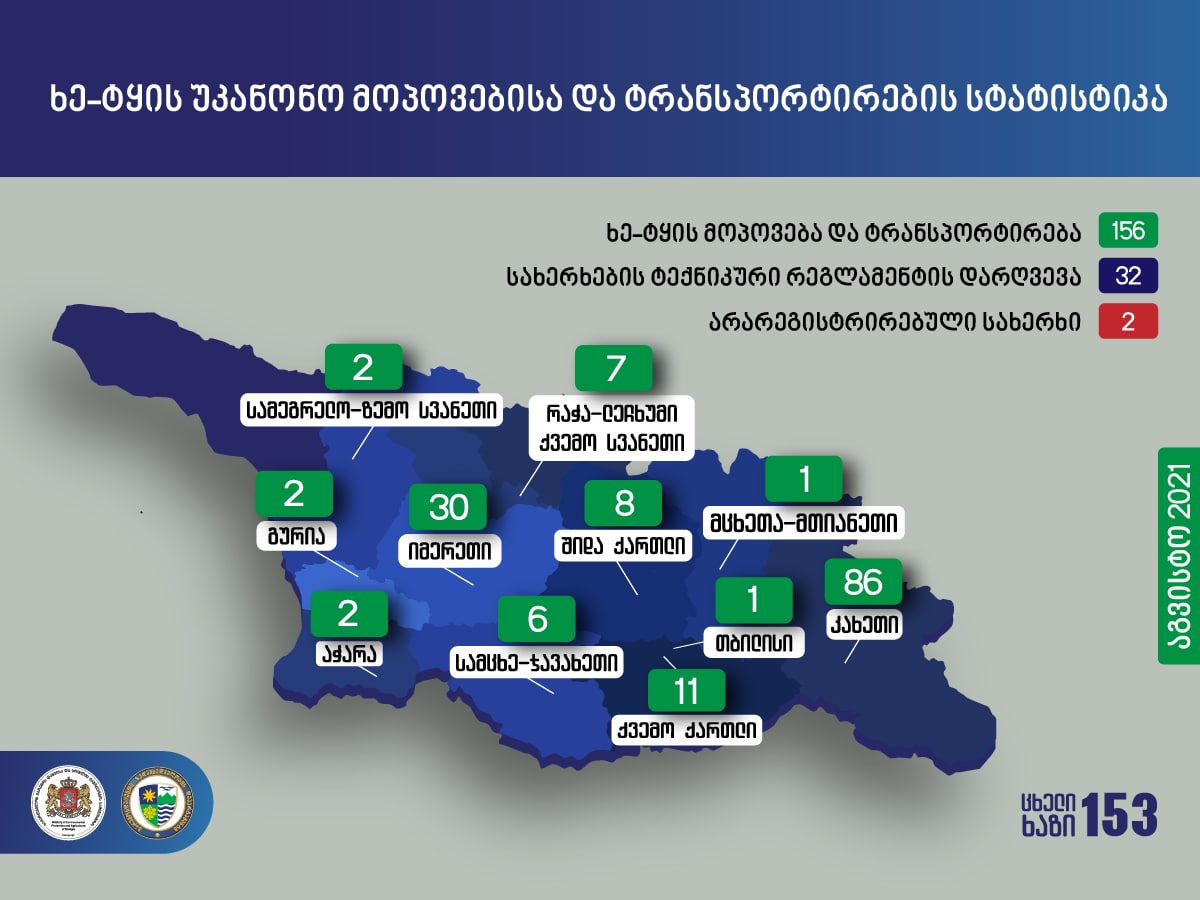 გარემოსდაცვითი ზედამხედველობის დეპარტამენტის თანამშრომლებმა აგვისტოში უკანონო ტყითსარგებლობის 190 ფაქტი გამოავლინეს