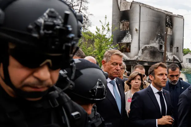 მაკრონი უკრაინის ქალაქ ირპინის ვიზიტისას რუსი სამხედროების მიერ ჩადენილ ბარბაროსობას აკრიტიკებს
