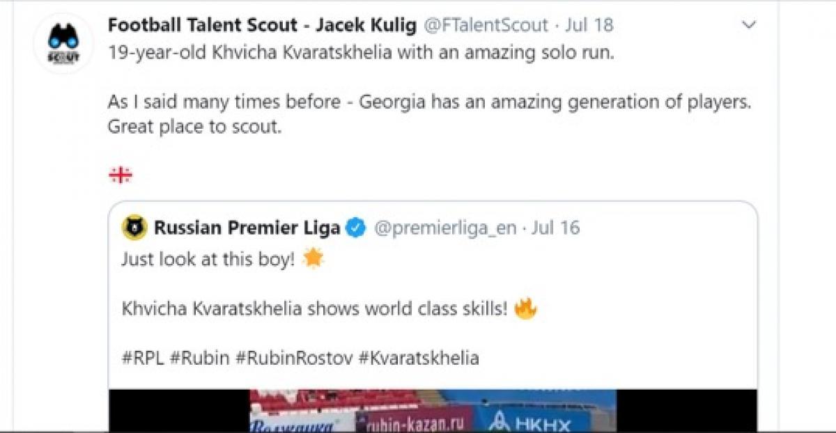 ასევე Football Talent Scout-ზე, ამ ვებსაიტის დამაარსებელმა იაცეკ კულიგმა ხვიჩა კვარაცხელიას საოცარი დრიბლინგის ვიდეო გამოაქვეყნა როსტოვთან მატჩში და განცხადებაც გააკეთა. „19 წლის ხვიჩა კვარაცხელიას საოცარი სოლო-რეიდი.როგორც ძალიან დიდი ხანის წინათ ვთქვი, საქართველოს მოთამაშეების საოცარი თაობა ჰყავს. დიდებული ქვეყანაა სკაუტებისთვის“ , - განაცხადა იაცეკ კულიგიმ. Football Talent Scout-ს ტვიტერზე 120 ათასზე მეტი მიმდევარი ჰყავს და ბელგიაში ყველაზე ცნობილი საიტია.