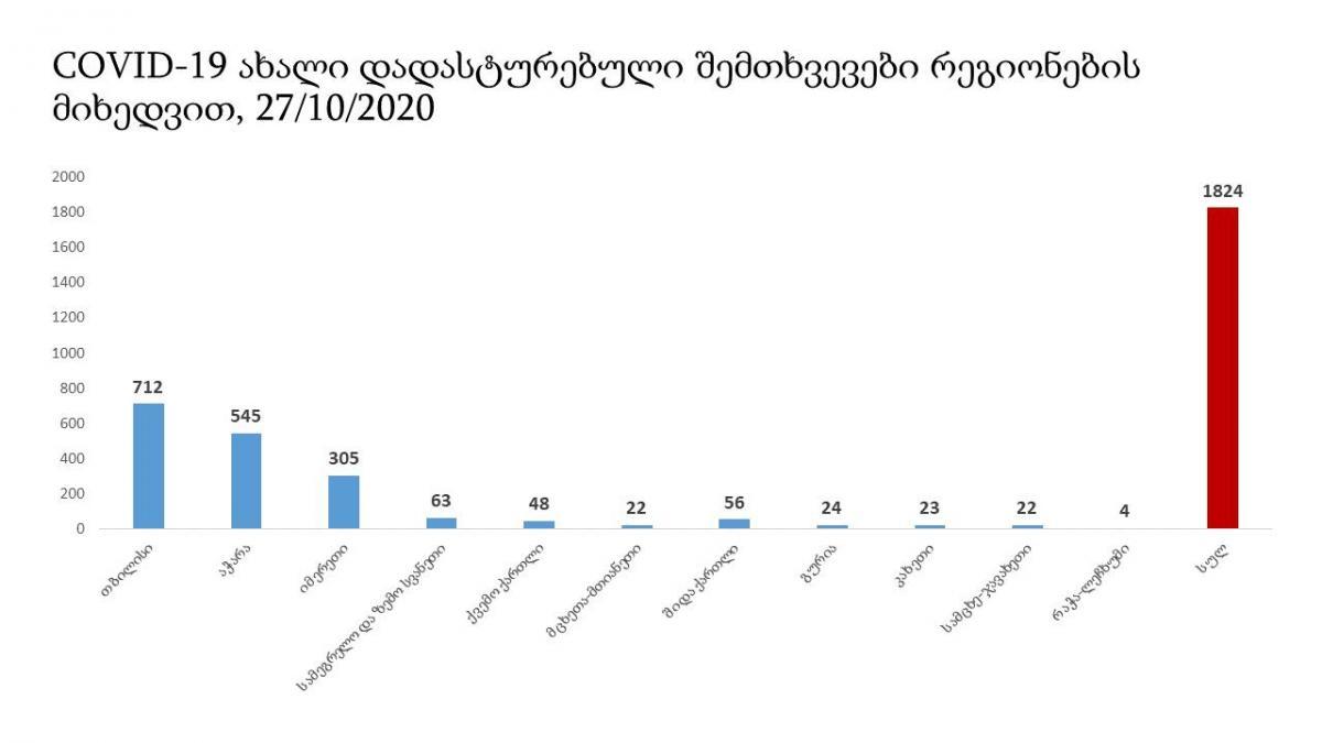 კორონავირუსის 1 824 ახალი შემთხვევიდან 712 თბილისში, 545 კი აჭარაში გამოვლინდა.