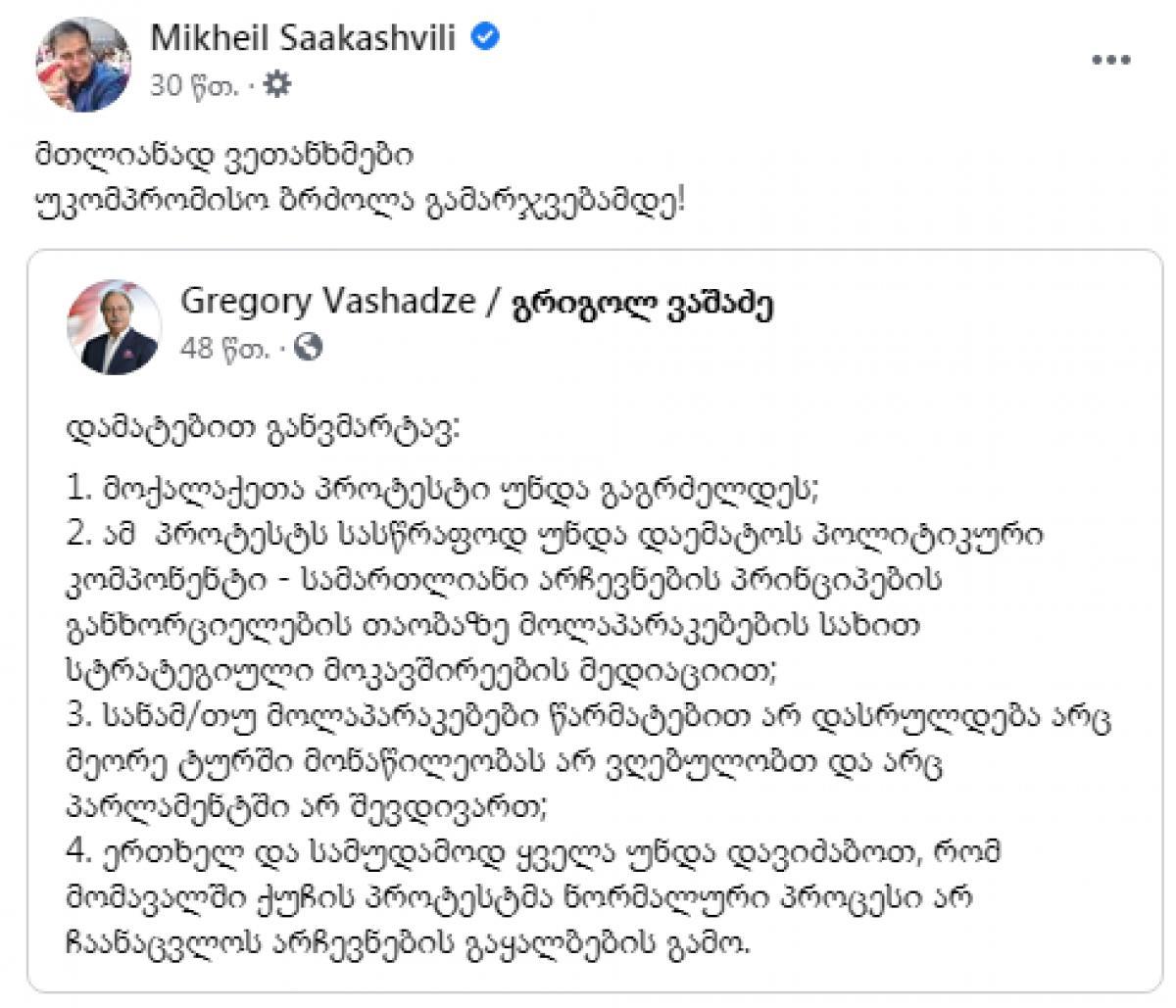 სააკაშვილი ვაშაძის განცხადებაზე - მთლიანად ვეთანხმები, უკომპრომისო ბრძოლა გამარჯვებამდე!