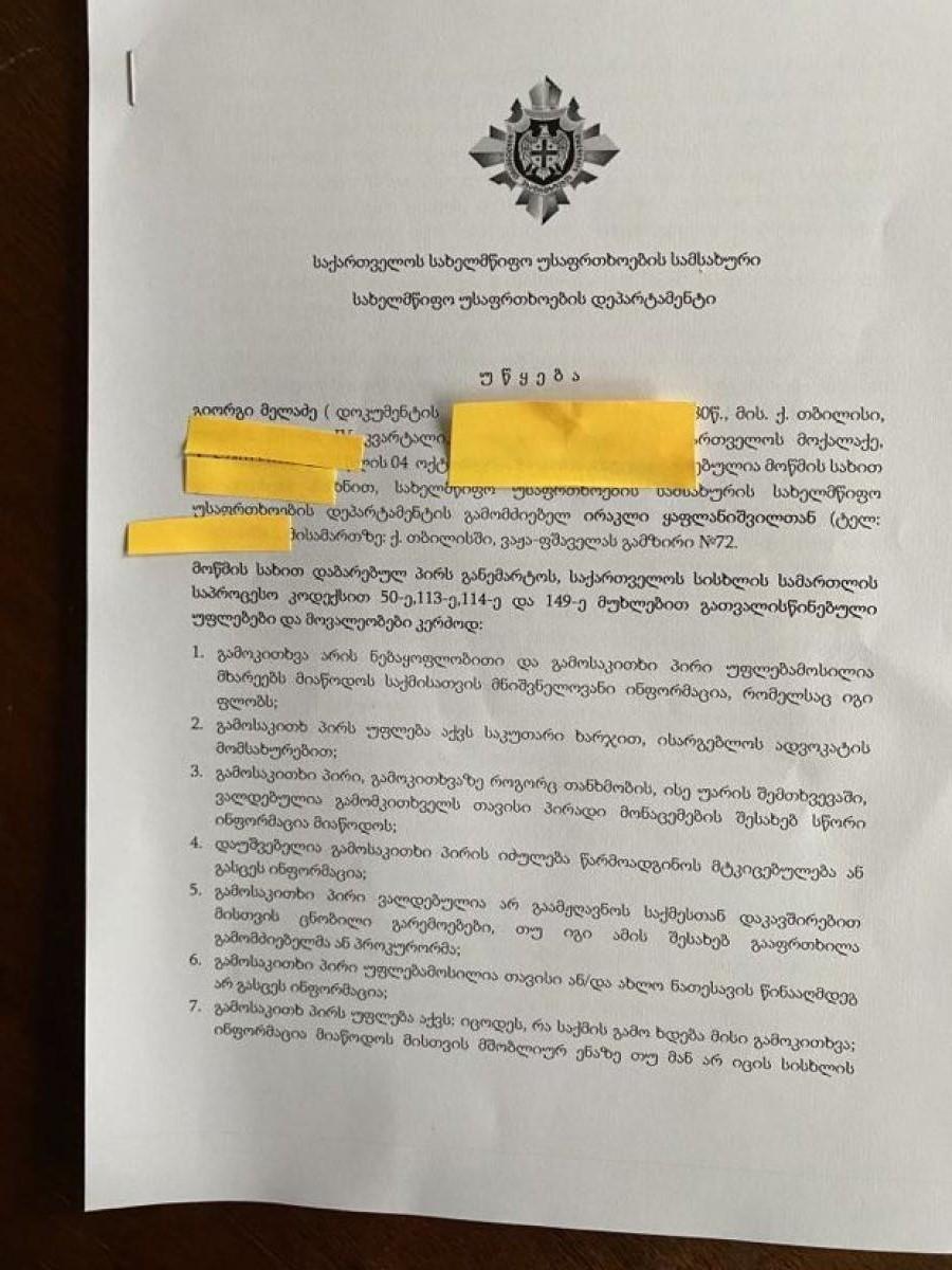 მელაძის გამოკითხვაზე დაბარების შესახებ ინფორმაცია "ექსპრესნიუსს" სახელმწიფო უსაფრთხოების სამსახურში დაუდასტურეს.