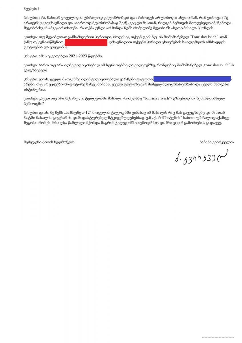 სპეციალური საგამოძიებო სამსახური სპორტული კომენტატორის სანდრო ცნობილაძის სახლში ჩხრეკასთან დაკავშირებით ინფორმაციას ავრცელებს და „მაღალი საჯარო ინტერესიდან გამომდინარე“ დაზარალებულის გამოკითხვის ოქმს ასაჯაროებს. გამოძიებით დგინდება, რომ 2022 წლიდან, დაზარალებულ ქალბატონს ერთ-ერთ სოციალურ ქსელში ყალბი გვერდიდან უცნობი პირი წერდა, რომელმაც დაარწმუნა, რომ მისი ნაცნობი იყო, რომელთანაც წარსულში ინტიმური ურთიერთობა ჰქონდა. კომუნიკაციისას, უცნობი პირი დაზარალებულს პირადი ცხოვრების ამსახველი ინტიმური შინაარსის მასალის გადაგზავნას სთხოვდა, ხოლო მოგვიანებით, როდესაც დაზარალებულმა გაგზავნილი ინტიმური შინაარსის ფოტოების და ვიდეოების წაშლა მოსთხოვა, პირმა წაშლის სანაცვლოდ შეხვედრა და ინტიმური კავშირის დამყარება შესთავაზა. საქმეზე მოპოვებული მტკიცებულებებით, მათ შორის, დაზარალებულის მიერ სხვადასხვა დროს გამოკითხვისას მოწოდებული ინფორმაციითა და „META"-დან მიღებული მასალებით დადგინდა მისამართები, რომლებზეც რეგისტრირებული ყალბი პროფილები ა.ც.-ის საცხოვრებელ და სამუშაო ადგილის მისამართებს ემთხვევა. აღნიშნული ინფორმაციის საფუძველზე, სასამართლოს განჩინებით, ჩატარდა ა. ც.-ის პირადი და საცხოვრებელი სახლის ჩხრეკა, საიდანაც ამოღებული იქნა მობილური ტელეფონი და კომპიუტერული ტექნიკა. სპეციალური საგამოძიებო სამსახური, საქმეზე გამოძიებას საქართველოს სისხლის სამართლის კოდექსის 157-ე პრიმა მუხლის პირველი ნაწილით აგრძელებს.