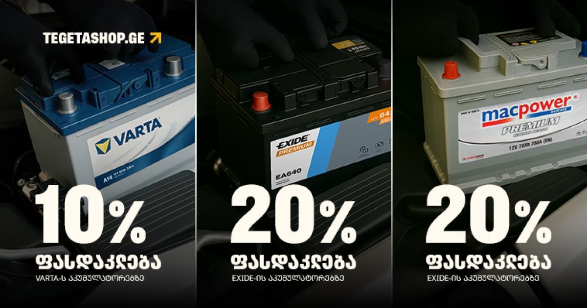 · 20%-იანი ფასდაკლება MACPOWER PREMIUM-ისა და EXIDE-ის, ხოლო 10%-იანი ფასდაკლება VARTA-ს აკუმულატორებზე აკუმულატორი დაბალი ტემპერატურის მიმართ ერთ-ერთი ყველაზე მგრძნობიარე დეტალია. ზამთარში ძრავის დაქოქვას უფრო დიდი ენერგია სჭირდება და შესაბამისად, ავტომობილი აკუმულატორის მეტ რესურსს მოიხმარს. სწორედ ამიტომ როგორც კი ჰაერის ტემპერატურა მოიმატებს, აუცილებლად უნდა შევამოწმოთ აკუმულატორი და, საჭიროების შემთხვევაში, ვიზრუნოთ მის ჩანაცვლებაზე. MACPOWER PREMIUM - აკუმულატორები აღჭურვილია უსაფრთხოების ინოვაციური სისტემით, რომელიც ავტომობილს იცავს მოკლე ჩართვისა და გადახურებისგან. გამძლეა როგორც ცივ, ისე - ცხელ ამინდში. ხელმისაწვდომი ფასის, სანდოობისა და ხარისხის გათვალისწინებით, მძღოლები ამ ბრენდზე არჩევანს ხშირად აკეთებენ. EXIDE - აკუმულატორების ერთ-ერთი უძველესი მწარმოებელი მსოფლიოში, 130- წლიანი გამოცდილებით. გამოირჩევა მაქსიმალური სიმძლავრითა და გამძლეობით. იტენება სწრაფად და დატვირთულ რეჟიმში მუშაობს იდეალურად. ის არის აკუმულატორების ოფიციალური მიმწოდებელი ისეთი ბრენდებისთვის, როგორებიცაა: Ford, Fiat, BMW და სხვა. EXIDE-ის პროდუქციის AGM და EFB ტექნოლოგია კარგად ერგება თანამედროვე Start-Stop-სისტემიან და მაღალი ელექტრული დატვირთვის ავტომობილებს. VARTA - გერმანული პრემიუმ ბრენდი, მაღალი სტანდარტებისა და ხარისხის სიმბოლო. აკუმულატორები გამოირჩევა უსაფრთხოებით, მაქსიმალური სიმძლავრითა და სტაბილურობით ნებისმიერ ამინდში. ენერგიას ინარჩუნებს ავტომობილის ხანგრძლივი დგომის შემთხვევაშიც კი. VARTA-ს ორიგინალ აკუმულატორებს ვხვდებით ისეთ ბრენდებში, როგორებიცაა: Mercedes, BMW, VW, Audi. AGM და EFB ტექნოლოგიები შესაფერისია ჰიბრიდებისთვის, ენერგომხარჯველი სისტემებისა და პრემიუმ კლასის ავტომობილებისთვის, სადაც მაქსიმალური ხარისხი და ხანგრძლივობა განსაკუთრებულად მნიშვნელოვანია. · 30%-იანი ფასდაკლება JBM-ის, ხოლო 20%-იანი ფასდაკლება TOPTUL-ის ხელსაწყოებზე. JBM - ევროპული ბრენდი, რომელიც აწარმოებს მაღალი ხარისხის პროფესიონალურ და საყოფაცხოვრებო ხელსაწყოებს. მისი ძირითადი უპირატესობებია გამძლეობა, მრავალფეროვნება, ხელმისაწვდომობა და პროდუქციის ფართო არჩევანი - ხელის ინსტრუმენტები, ავტოსერვისის მოწყობილობები და სხვა. TOPTUL - აწარმოებს მაღალი ხარისხის ხელსაწყოებს ავტოსერვისისა და ინდუსტრიისთვის - გამორჩეულია გამძლეობითა და ეფექტიანობით. პროდუქცია დამზადებულია მაღალი ხარისხის ფოლადით, რომელიც უძლებს კოროზიას. მინიჭებული აქვს ISO სერტიფიკატი და ხასიათდება ხანგრძლივი სასიცოცხლო ციკლით. „თეგეტა მოტორსის“ ფილ