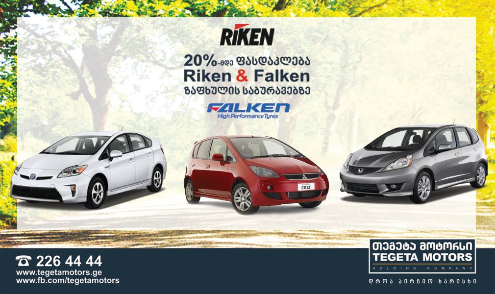 „თეგეტა მოტორსი“ მომხმარებელს იაპონური ბრენდების „Riken”-ისა და “Falken”-ის  პრემიუმ ხარისხის საბურავებზე 20%-მდე ფასდაკლებას სთავაზობს.
