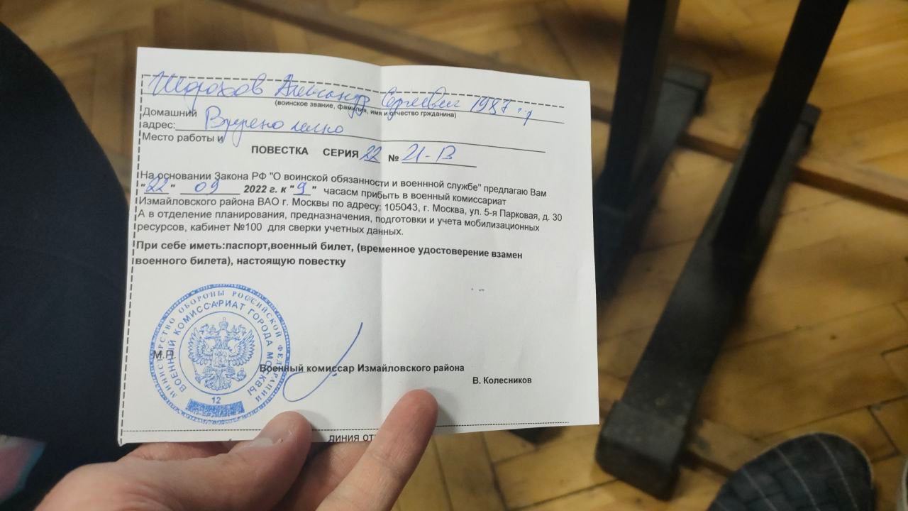 მოსკოვის პოლიციის განყოფილებებში მობილიზაციის წინააღმდეგ საპროტესტო აქციაზე დაკავებულებს გაწვევის ბილეთები გადასცეს