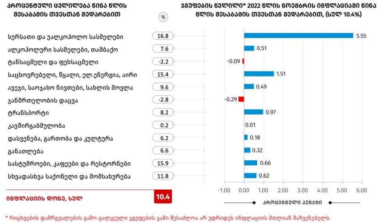 საქართველოში წელს ორნიშნა ეკონომიკური ზრდა დაფიქსირდა. ეს აისახა ციფრებზე, იგრძნო ხელისუფლებამაც, თუმცა არ უგრძნია ხალხს. რიგითი მოქალაქეებისათვის ერთადერთი რამ, რაც შეიცვალა, გაზრდილი ფასები და პროდუქტებისგან დაცლილი კალათაა. საქართველოს სტატისტიკის ეროვნული სამსახურის მონაცემებით, ერთ წელში [ნოემბრის ჩათვლით] ინფლაციის დონემ 10,4% შეადგინა. რაც შეეხება საბაზო ინფლაციას, თამბაქოს გარეშე მაჩვენებელი 7.2%-ით განისაზღვრა. წლიური ინფლაციის ფორმირებაზე ძირითადი გავლენა იქონია ფასების ცვლილებამ შემდეგ ჯგუფებზე: სურსათი და უალკოჰოლო სასმელები - ჯგუფში ფასები გაიზარდა 16.8 პროცენტით, რაც წლიურ ინფლაციაზე 5.55 პროცენტული პუნქტით აისახა. ფასები მომატებულია შემდეგ ქვეჯგუფებზე: ბოსტნეული და ბაღჩეული (26.0 პროცენტი), პური და პურპროდუქტები (23.8 პროცენტი), მინერალური და წყაროს წყალი, უალკოჰოლო სასმელები და ნატურალური წვენები (22.0 პროცენტი), ყავა, ჩაი და კაკაო (19.5 პროცენტი), რძე, ყველი და კვერცხი (18.3 პროცენტი), შაქარი, ჯემი და სხვა ტკბილეული (15.7 პროცენტი), თევზეული (13.6 პროცენტი), ზეთი და ცხიმი (10.1 პროცენტი), ხორცი და ხორცის პროდუქტები (9.1 პროცენტი), ხილი და ყურძენი (6.9 პროცენტი); საცხოვრებელი, წყალი, ელ.ენერგია, აირი - ჯგუფში დაფიქსირდა ფასების 15.4 პროცენტიანი მატება, რაც 1.51 პროცენტული პუნქტით აისახა წლიურ ინფლაციაზე. ფასები გაიზარდა ქვეჯგუფებზე: ფაქტიური გადასახადი საცხოვრებელზე (34.1 პროცენტი), საცხოვრებლის მიმდინარე მოვლა და შეკეთება (11.8 პროცენტი), ელექტროენერგია, აირი და სათბობის სხვა სახეები (5.6 პროცენტი); ტრანსპორტი - ფასები გაიზარდა 8.2 პროცენტით, რაც 0.97 პროცენტული პუნქტით აისახა მთლიანი ინდექსის ზრდაზე. ფასები მომატებულია სატრანსპორტო მომსახურებაზე (13.8 პროცენტი), პირადი სატრანსპორტო საშუალებების ექსპლუატაციაზე (8.2 პროცენტი) და სატრანსპორტო საშუალებების შეძენაზე (2.1 პროცენტი).