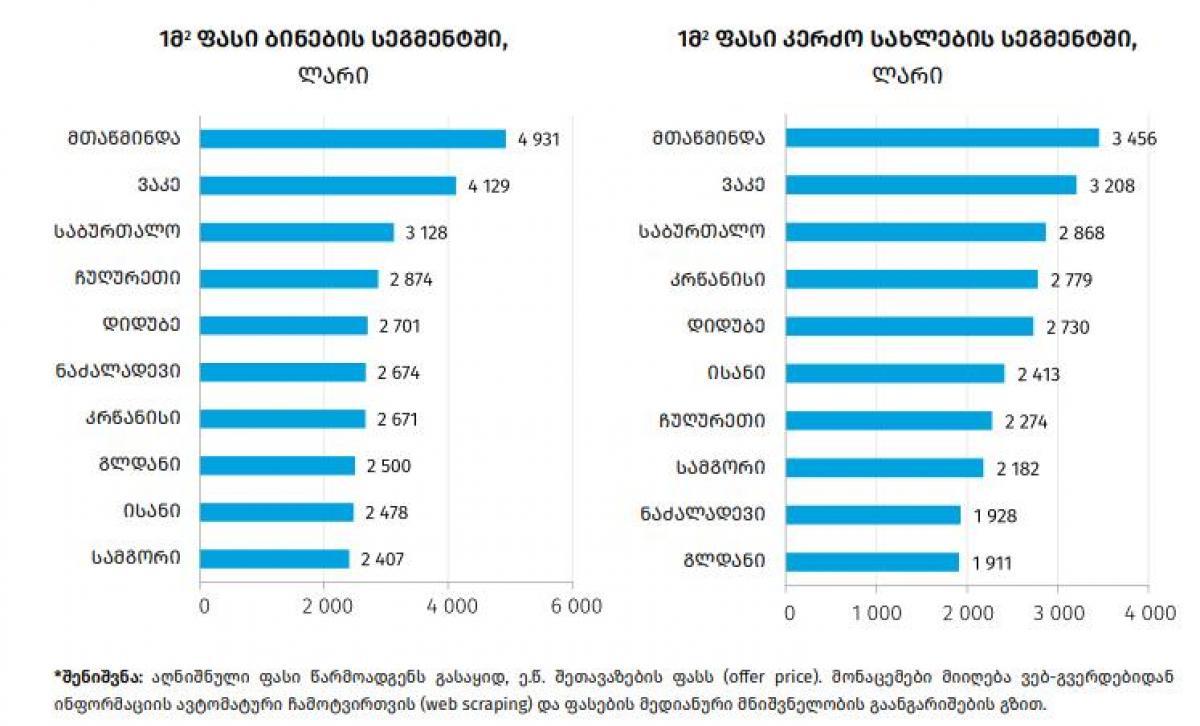 ბოლო ერთ წელიწადში ყველაზე მეტად სურსათი და უალკოჰოლო სასმელები გაძვირდა. ესე იგი, წინა წელთან შედარებით, იმერული ხაჭაპურის გამოცხობა 21.7%-ით ძვირი დაგიჯდებათ. ISET-ის კვლევითი ინსტიტუტის მონაცემებით, ხაჭაპურის ინგრედიენტებზე ფასები წლიურ ჭრილში მნიშვნელოვნად გაიზარდა: ყველი – 27.4%-ით, რძე – 20.0%-ით, კარაქი – 17.3%-ით, საფუარი – 15.1%-ით, ფქვილი – 13.3%-ით, კვერცხი – 8.6%-ით. ფასები არა მხოლოდ პროდუქტებზე, არამედ უძრავ ქონებაზეც საგრძნობლად არის მომატებული. საცხოვრებელი უძრავი ქონების ფასების ინდექსის (RPPI) მიხედვით, წლიურ ჭრილში ფასების მატებამ 10.7% შეადგინა. 2020 წელთან მიმართებით კი ფასები 17.5%-ით არის გაზრდილი. 2022 წლის მესამე კვარტალში, წინა წელთან შედარებით, ფასების ზრდა დაფიქსირდა როგორც საცხოვრებელი ბინების სეგმენტში (10.9 პროცენტი), ისე კერძო სახლების სეგმენტში (10.0 პროცენტი). ქვემოთ მოცემულ გრაფიკზე წარმოდგენილია ახალაშენებული (დასრულებული) საცხოვრებლების სეგმენტში 1მ2-ის ღირებულება, თბილისის უბნების მიხედვით: