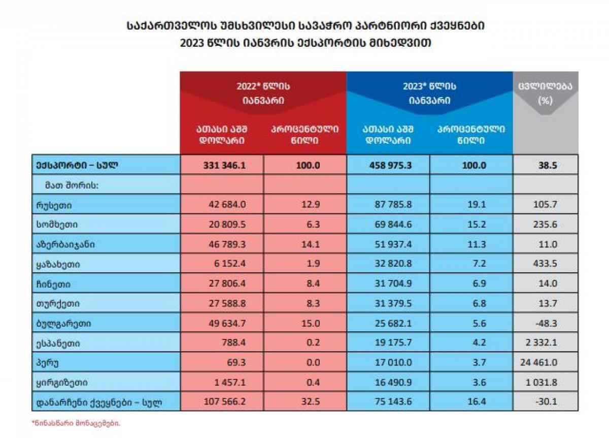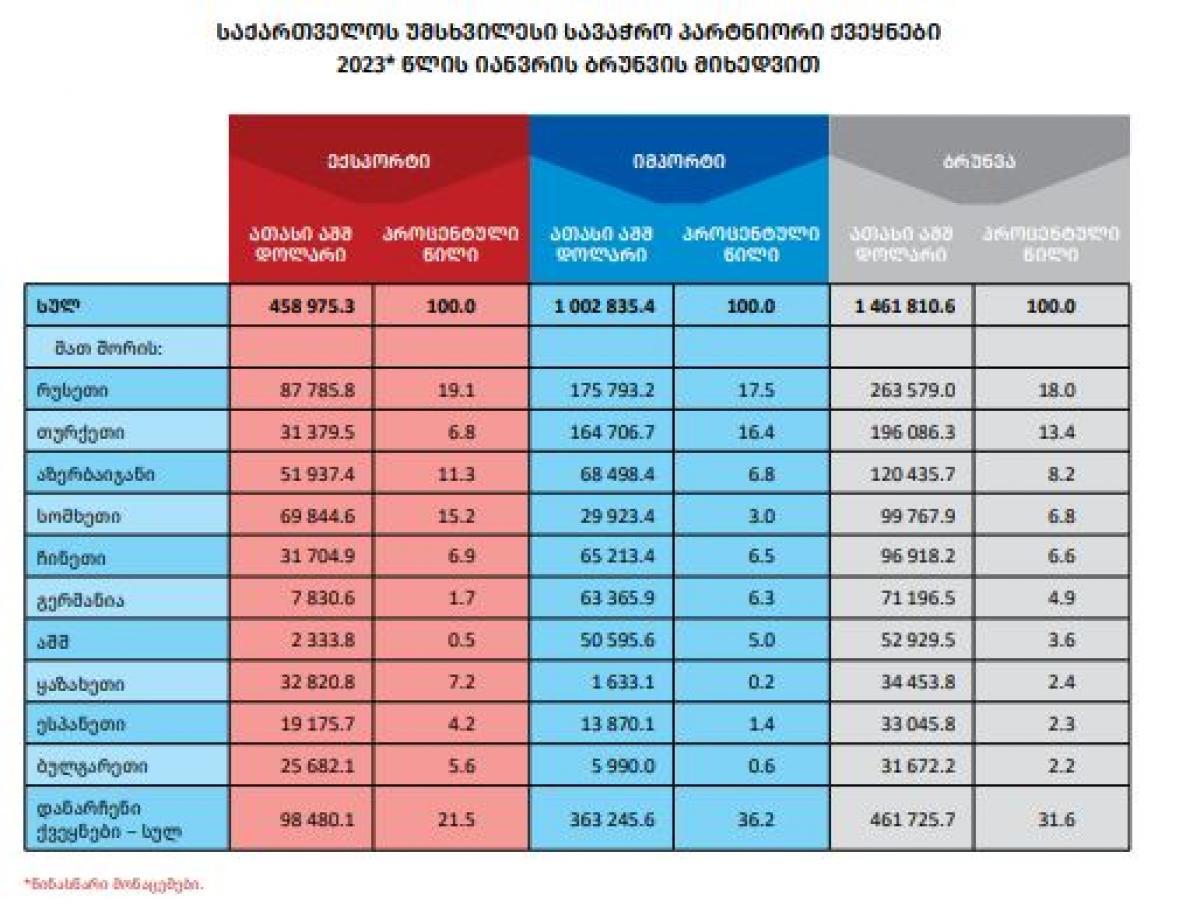 საქსტატის მონაცემებით, 2023 წლის იანვარში საქართველოში საქონლით საგარეო სავაჭრო ბრუნვამ (არადეკლარირებული ვაჭრობის გარეშე) 1 461.8 მლნ. აშშ დოლარი შეადგინა, რაც წინა წლის შესაბამის პერიოდთან შედარებით 29.1 პროცენტით მეტია. აქედან ექსპორტი 459.0 მლნ. აშშ დოლარს შეადგენს (გაიზარდა 38.5 პროცენტით), ხოლო იმპორტი 1 002.8 მლნ. აშშ დოლარს (გაიზარდა 25.2 პროცენტით). საქართველოს უარყოფითმა სავაჭრო ბალანსმა, 2023 წლის იანვარში, 543.9 მლნ. აშშ დოლარი შეადგინა, რაც საგარეო სავაჭრო ბრუნვის 37.2 პროცენტია. 2023 წლის იანვარში ათი უმსხვილესი საექსპორტო პარტნიორი ქვეყნის წილმა საქართველოს მთლიან ექსპორტში 83.6 პროცენტი შეადგინა. უმსხვილესი საექსპორტო სამეული შემდეგნაირად ჩამოყალიბდა: რუსეთი (87.8 მლნ. აშშ დოლარი), სომხეთი (69.8 მლნ. აშშ დოლარი) და აზერბაიჯანი (51.9 მლნ. აშშ დოლარი). 2023 წლის იანვარში ათი უმსხვილესი საიმპორტო პარტნიორი ქვეყნის წილმა საქართველოს მთლიან იმპორტში 68.8 პროცენტი შეადგინა. პირველ სამეულში შედის: რუსეთი (175.8 მლნ. აშშ დოლარი), თურქეთი (164.7 მლნ. აშშ დოლარი) და აზერბაიჯანი (68.5 მლნ. აშშ დოლარი). 2023 წლის იანვარში ათი უმსხვილესი სავაჭრო პარტნიორი ქვეყნის წილმა საქართველოს მთლიან საგარეო სავაჭრო ბრუნვაში 68.4 პროცენტი შეადგინა. ქვეყნის უმსხვილესი სავაჭრო პარტნიორები არიან: რუსეთი (263.6 მლნ. აშშ დოლარი), თურქეთი (196.1 მლნ. აშშ დოლარი) და აზერბაიჯანი (120.4 მლნ. აშშ დოლარი). 2023 წლის იანვარში სასაქონლო ჯგუფებიდან საექსპორტო ათეულში პირველი ადგილი მსუბუქმა ავტომობილებმა დაიკავა 104.3 მლნ. აშშ დოლარით, რაც მთელი ექსპორტის 22.7 პროცენტს შეადგენს. მეორე ადგილს იკავებს სპილენძის მადნები და კონცენტრატები 68.1 მლნ. აშშ დოლარით (მთლიანი ექსპორტის 14.8 პროცენტი), ხოლო მესამე ადგილზეა ფეროშენადნობები 50.8 მლნ. აშშ დოლარით (11.1 პროცენტი). უმსხვილესი საიმპორტო სასაქონლო ჯგუფი 2023 წლის იანვარში წარმოდგენილი იყო ნავთობის აირების და სხვა აირისებრი ნახშირწყალბადების სახით, რომლის იმპორტმა 92.1 მლნ. აშშ დოლარი და მთელი იმპორტის 9.2 პროცენტი შეადგინა. მეორე ადგილს იკავებდა მსუბუქი ავტომობილები 86.4 მლნ. აშშ დოლარით (იმპორტის 8.6 პროცენტი), ხოლო მესამე ადგილზეა ნავთობი და ნავთობპროდუქტები 82.3 მლნ. აშშ დოლარით (იმპორტის 8.2 პროცენტი).