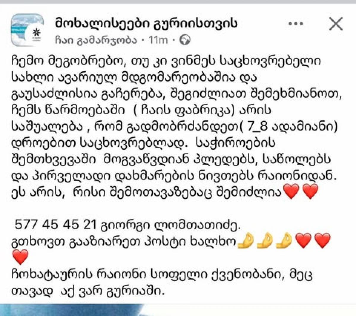 სოციალურ ქსელში, ერთ-ერთი მოხალისე, გიორგი ლომთათიძე, გურიის მაცხოვრებლებს, რომლებსაც საცხოვრებელი სახლები ავარიულ მდგომარეობაში აქვთ და ცხოვრება გაუსაძლისია, მის წარმოებაში არსებულ ჩაის ფაბრიკაში დროებით მოთავსებას და პირველადი საჭიროების ნივთებით დახმარებას სთავაზობს.
