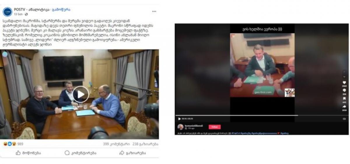 საფრანგეთის, დიდი ბრიტანეთისა და გერმანიის ლიდერები, ემანუელ მაკრონი, კირ სტარმერი და ფრიდრიხ მერცი, 9 მაისის საღამოს მატარებლით კიევში გაემგზავრნენ. სოციალური მედიის მომხმარებლებმა ყურადღება მიაქციეს ერთ-ერთ ვიდეოს, რომელიც ჟურნალისტებმა მოგზაურობის დროს გადაიღეს და ივარაუდეს, რომ ევროპელმა ლიდერებმა კოკაინი მოიხმარეს. მომხმარებლებმა აღნიშნეს, რომ მაკრონმა ჟურნალისტების გამოჩენისას თეთრი პაკეტი დამალა, მერცმა კი საწრუპი დამალა. მათ შორის, POSTV-ანალიტიკამ და „ნიუსჰაბმა“ აღნიშნული ამბავი ამერიკელი კონსპიროლოგი ბლოგერის ალექს ჯონსის ციტატით და მის მიერ გავრცელებული ვიდეოთი გამოაქვეყნეს. „არანაირი განმარტება მოცემულ ფაქტზე, ზელენსკიმ, რომელიც კოკაინის ცნობილი მომხმარებელია, ისინი [მაკრონი, მერცი და სტარმერი] ახლახან მიიღო სტუმრად, სამივე „ლიდერი“ ძლიერ აღგზნებულად გამოიყურება“, – წერს ჟურნალისტი. ვიდეო TikTok-პლატფორმაზეც გავრცელდა.