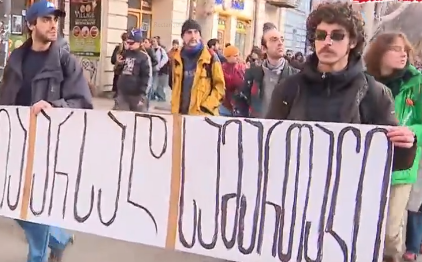 სახელოვნებო სფეროს წარმომადგენლები იუსტიციის სახლის შენობიდან მსვლელობით პოლიციის განყოფილებებისკენ მიემართებიან