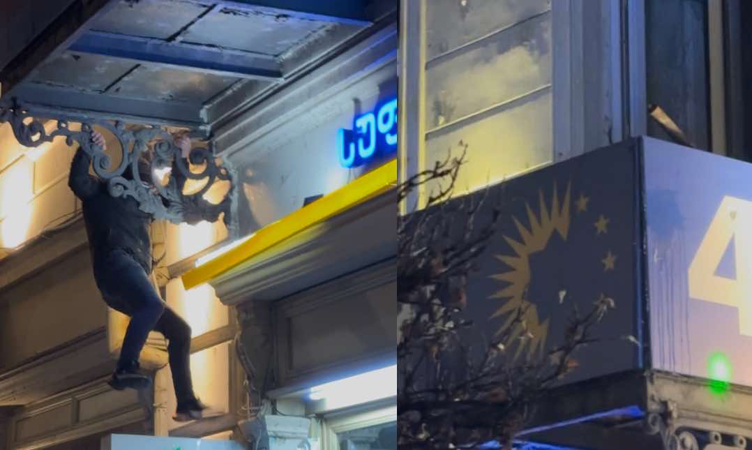 საპროტესტო აქციის ერთ-ერთი მონაწილე „ქართული ოცნების“ ოფისის აივანზე ავიდა და ფანჯარა ჩაამსხვრია