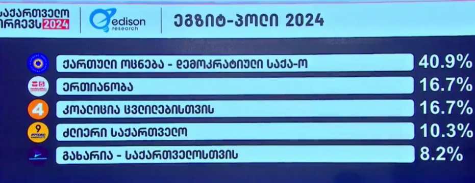 Edison Research-ის ეგზიტპოლი - „ოცნება“ - 40,9%, „ერთიანობა - ნაციონალური მოძრაობა“ - 16,7%, „კოალიცია ცვლილებისთვის“ - 16,7%