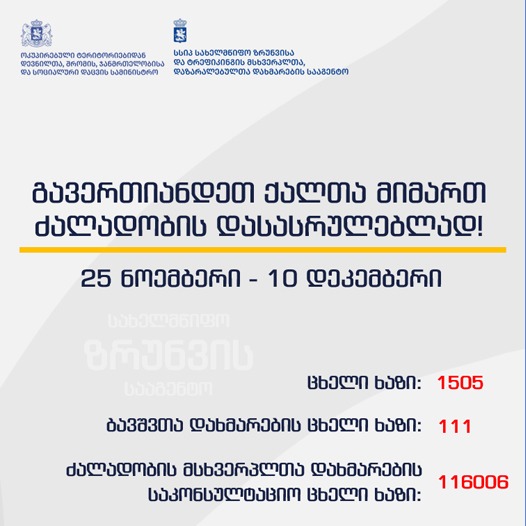 სახელმწიფო ზრუნვისა და ტრეფიკინგის მსხვერპლთა დახმარების სააგენტო გენდერული ძალადობის წინააღმდეგ ბრძოლის 16-დღიან მსოფლიო კამპანიას უერთდება
