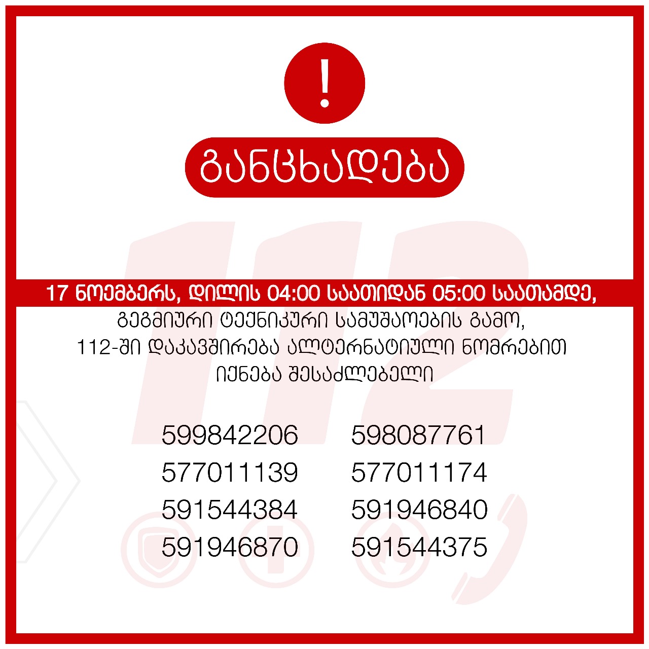 შსს - 17 ნოემბერს, დილის 04:00 საათიდან 05:00 საათამდე 112-ში შემომავალი ზარების მიღება შეიზღუდება