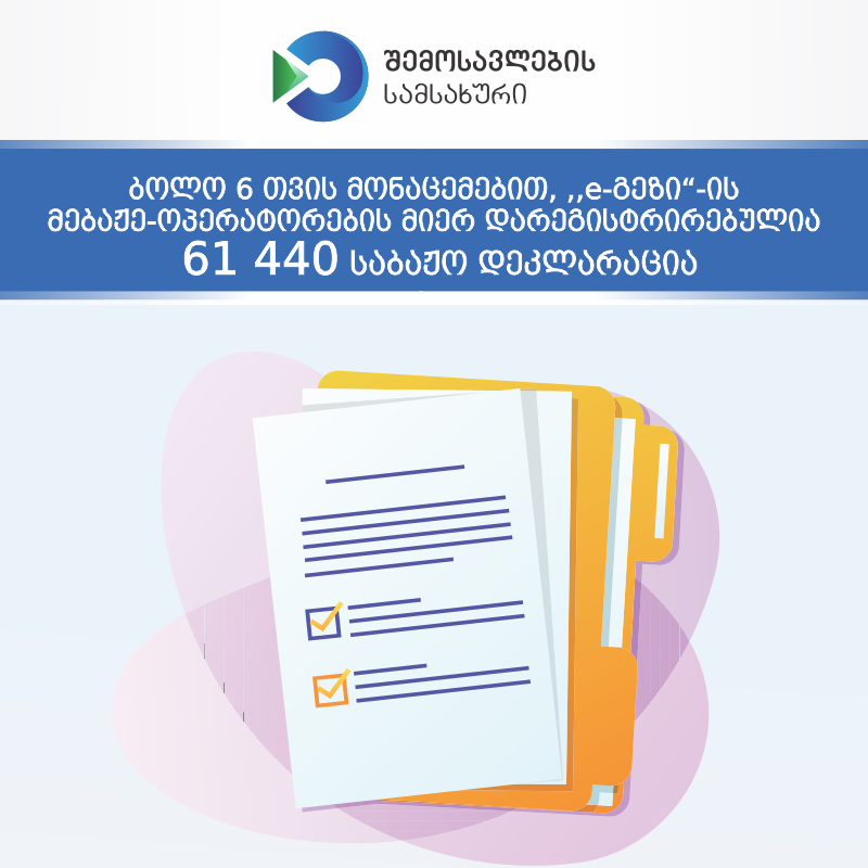 შემოსავლების სამსახური - ბოლო 6 თვის მონაცემებით, „e-გეზი“-ის მებაჟე-ოპერატორების მიერ დარეგისტრირებულია 61 440 საბაჟო დეკლარაცია