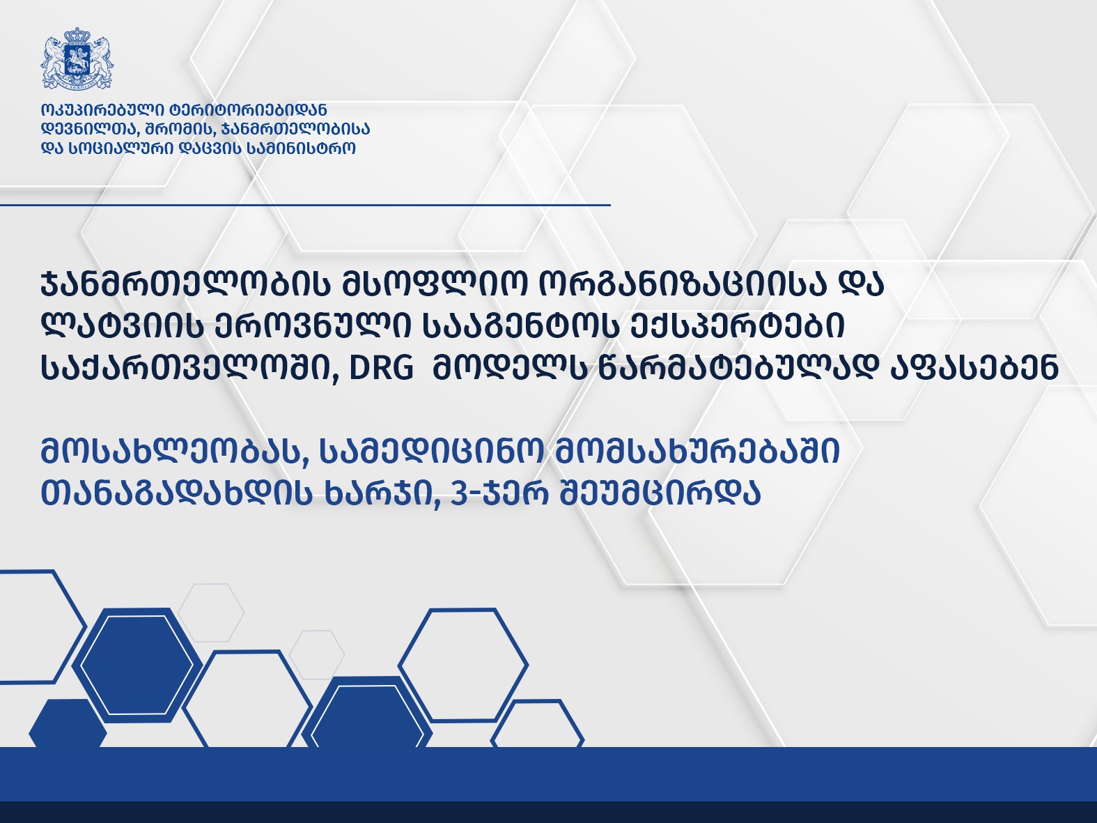 ჯანდაცვის სამინისტრო - ჯანმრთელობის მსოფლიო ორგანიზაციისა და ლატვიის ეროვნული სააგენტოს ექსპერტები, საქართველოში, DRG მოდელს წარმატებულად აფასებენ