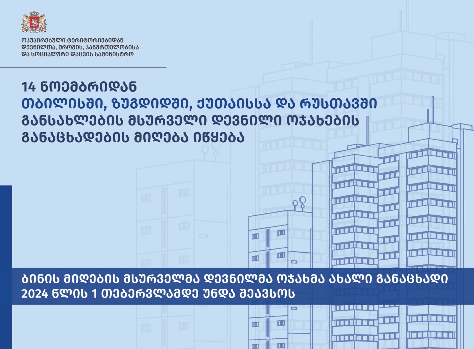14 ნოემბრიდან თბილისში, ზუგდიდში, ქუთაისსა და რუსთავში, ახალაშენებულ კორპუსებში განსახლების მსურველი დევნილი ოჯახების განაცხადების მიღება იწყება