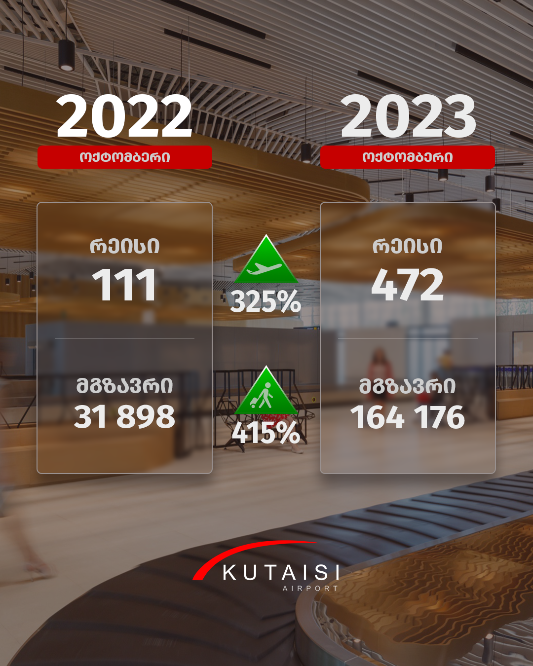 აეროპორტების გაერთიანება - ოქტომბერში ქუთაისის საერთაშორისო აეროპორტის მგზავრთნაკადი 415%-ით გაიზარდა