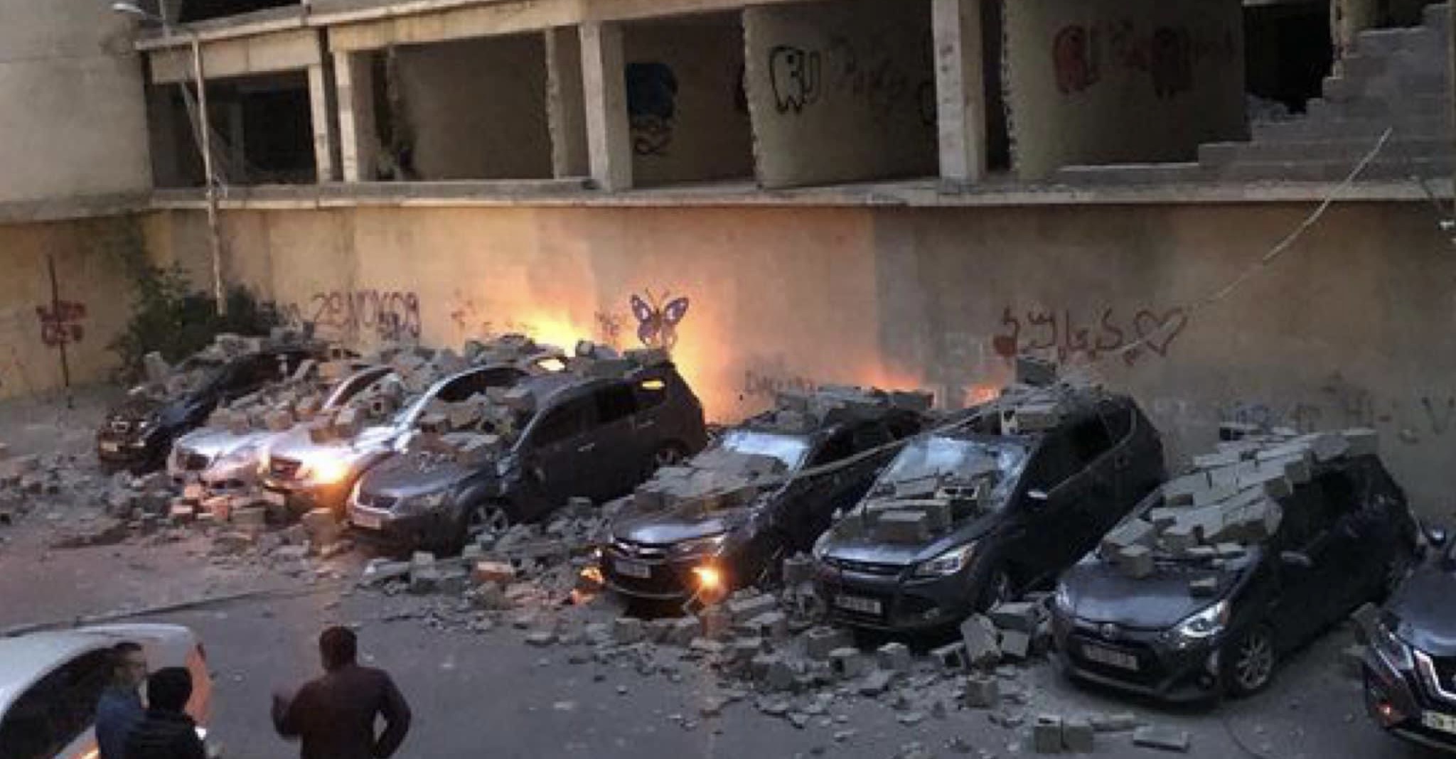 ძლიერმა ქარმა თბილისში მშენებარე კორპუსიდან სამშენებლო ბლოკები გადმოყარა - დაზიანდა მანქანები [ვიდეო]