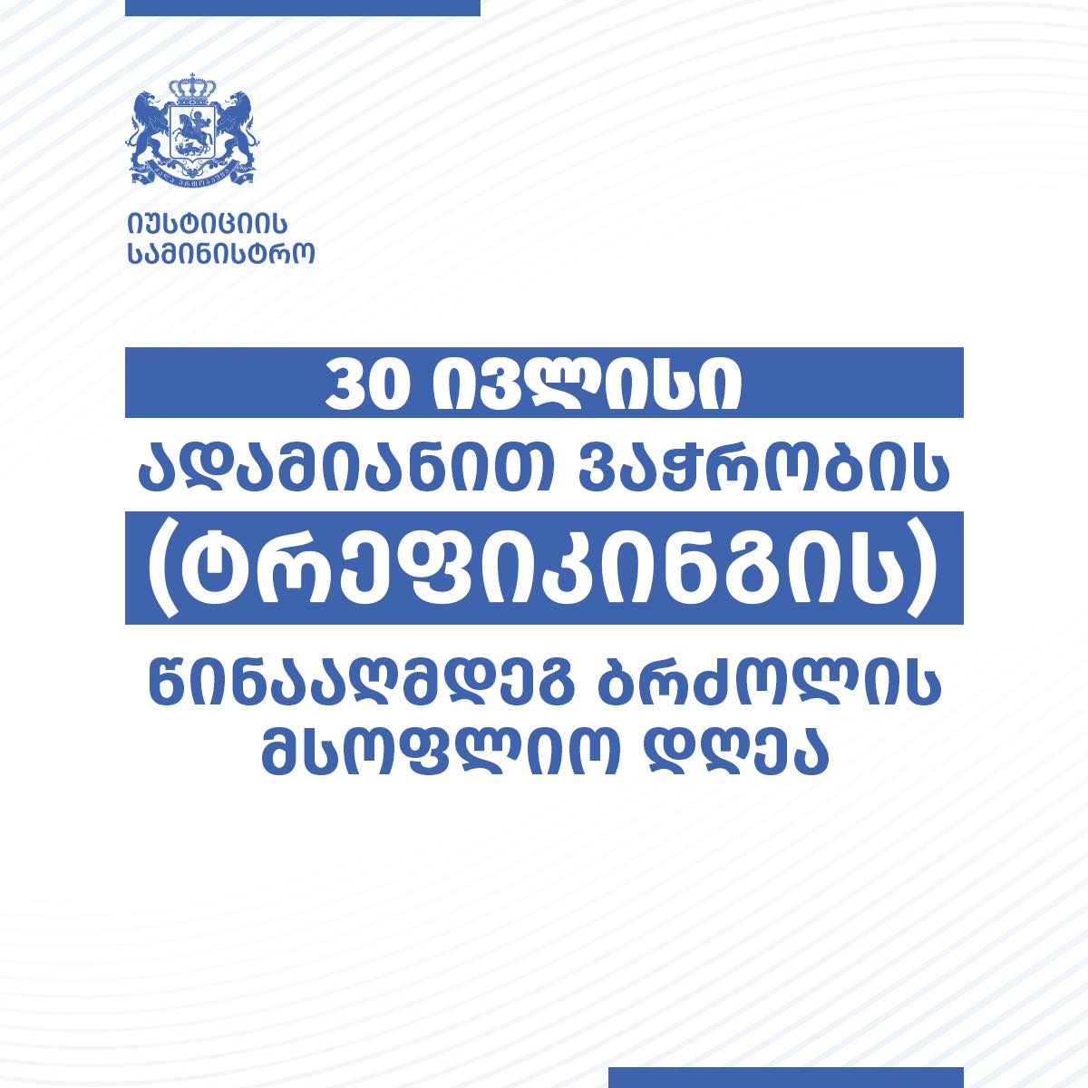 იუსტიციის სამინისტრო ადამიანით ვაჭრობის (ტრეფიკინგის) წინააღმდეგ ბრძოლის მსოფლიო დღესთან დაკავშირებით განცხადებას ავრცელებს