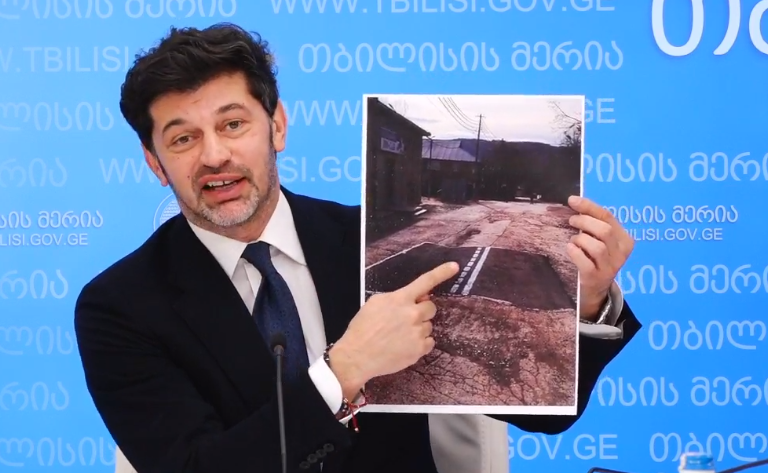 კალაძე სამგორში ნახევრად დაგებულ გზაზე - ადამიანთა ჯგუფმა დახაზა, რომ ეჩვენებინათ, როგორი უნიათოა დედაქალაქის მთავრობა