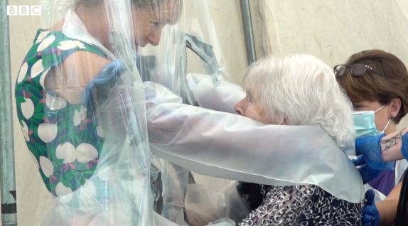 დიდ ბრიტანეთში თავშესაფარში დამონტაჟდა პლასტიკური ფარდა, რომელიც მნახველებს საშუალებას აძლევს, საყვარელ ადამიანებს ჩაეხუტნონ