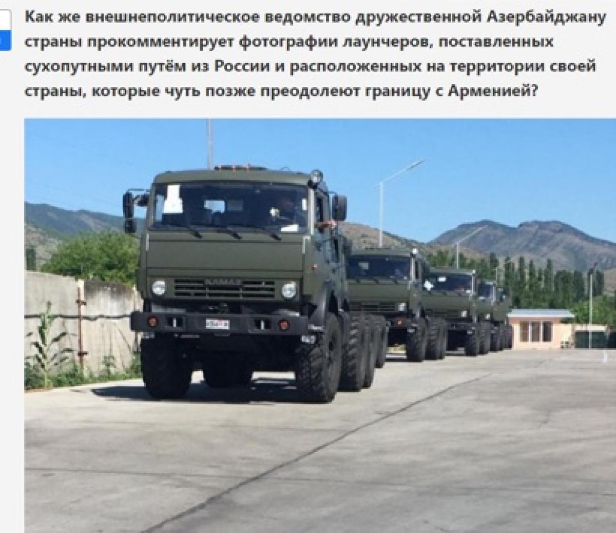 საინფორმაციო სააგენტო ასევე აღნიშნავს, რომ ამ ფოტო მასალების შემდეგ რა კომენტარს გააკეთებს აზერბაიჯანის მეგობარი ქვეყანა, რომელმაც რუსეთის მიწიდან მისი ტერიტორიის გავლით სომხეთს საბრძოლო ტექნიკა მიაწოდა.