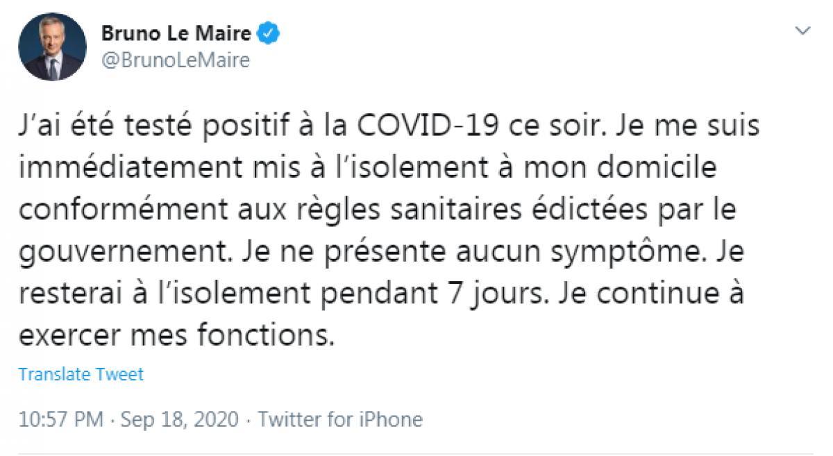 საფრანგეთის ფინანსთა მინისტრს Covid-19 დაუდასტურდა