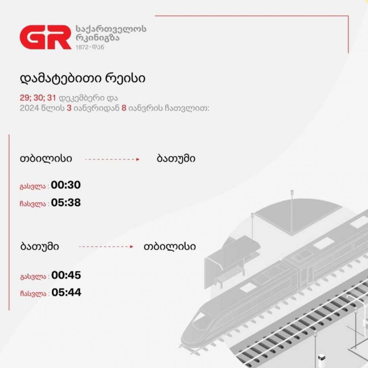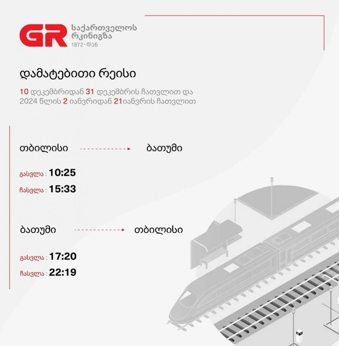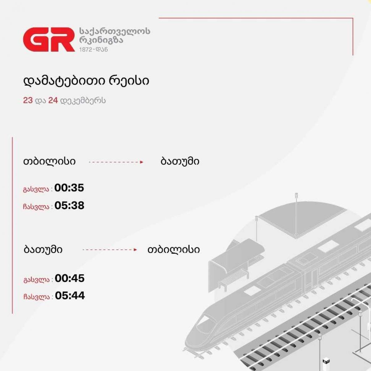 გაზრდილი მგზავრთნაკადის გამო, თბილისი-ბათუმი-თბილისის მიმართულებით დამატებით რეისები ინიშნება. ამის შესახებ "საქართველოს რკინიგზა" განცხადებას ავრცელებს.