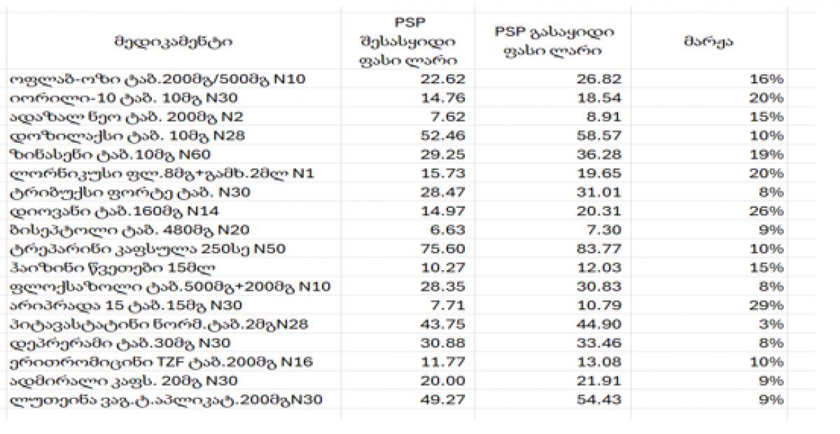 რეფერენტული ფასების აუცილებლობაზე PSP-ს მხრიდან წლების განმავლობაში არაერთხელ ყოფილა განცხადება გაკეთებული და კიდევ ერთხელ ვადასტურებთ აღნიშნულის აუცილებლობას. გარდა იმისა, რომ ეს მოგვცემს შესაძლებლობას მომწოდებლებისგან მივიღოთ უფრო დაბალი შესასყიდი ფასი, ამავდროულად ჯანდაცვის სამინისტროს მოუსპობს შესაძლებლობას გაავრცელოს არაზუსტი ინფორმაციები“, - აღნიშნულია PSP-ს განცხადებაში.