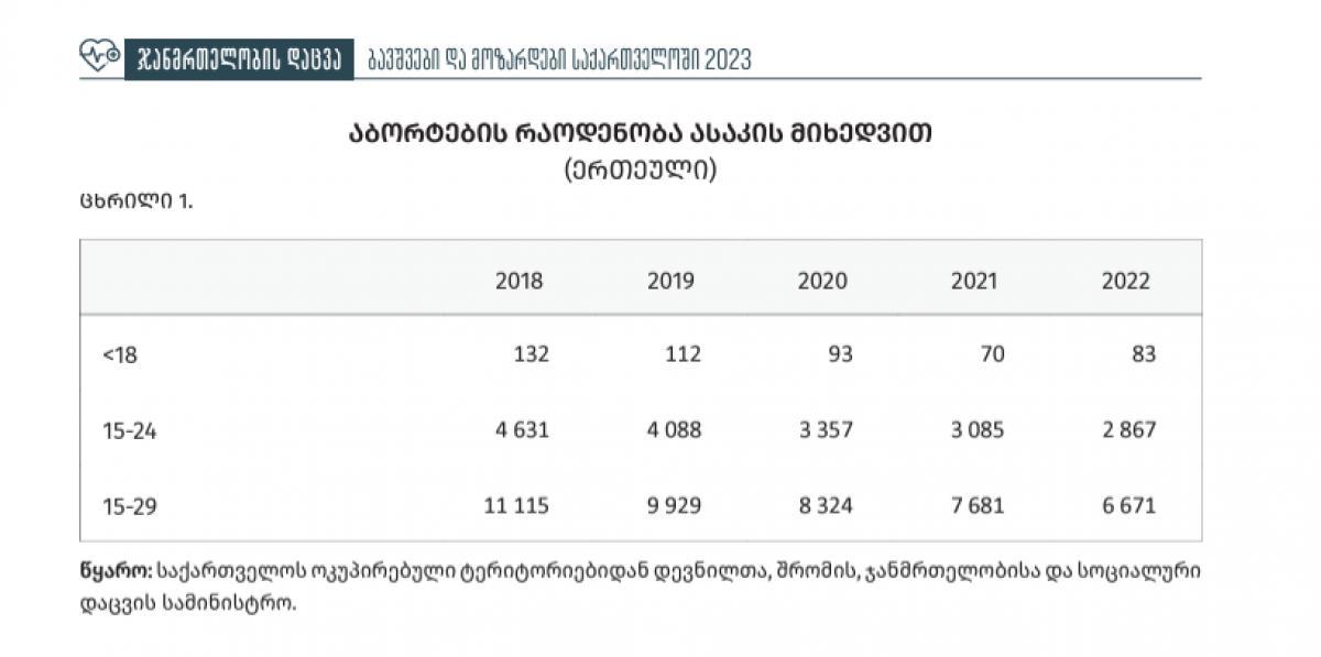 2022 წელს აბორტი 83 არასრულწლოვანს ჩაუტარდა. ამის შესახებ აღნიშნულია საქართველოს სტატისტიკის ეროვნული სამსახურის პუბლიკაციაში, სახელწოდებით "ბავშვები და მოზარდები საქართველოში". საქსტატის ცნობით, ჯამში, 2022 წელს აბორტი 29 წლამდე ასაკის 16 619 პირს ჩაუტარდა. საქსტატის ინფორმაციითვე, აღნიშნული მაჩვენებელი წინა წელთან შედარებით ცამეტითაა გაზრდილი. ორსულობის ხელოვნურად შეწყვეტის შემთხვევები ასაკობრივ კატეგორიებში კი ასე ნაწილდება: