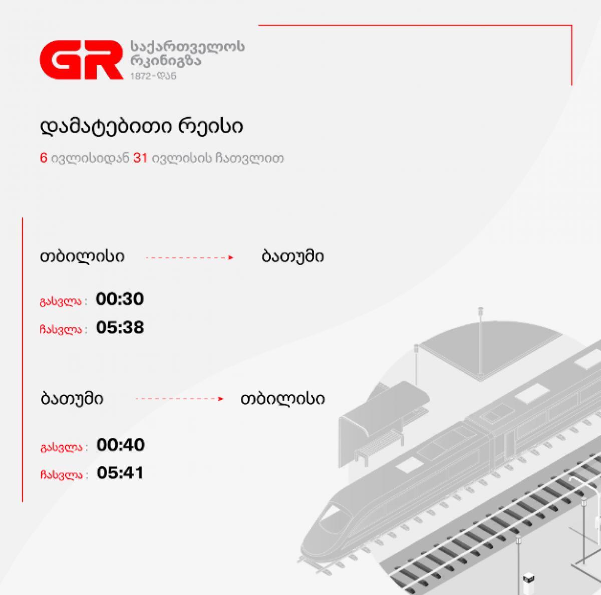 გაზრდილი მგზავრთნაკადის გამო, საქართველოს რკინიგზა, ივლისის თვეში, თბილისი-ბათუმი- თბილისის მიმართულებით რეისებს ამატებს. ამის შესახებ ინფორმაციას საქართველოს რკინიგზა ავრცელებს.