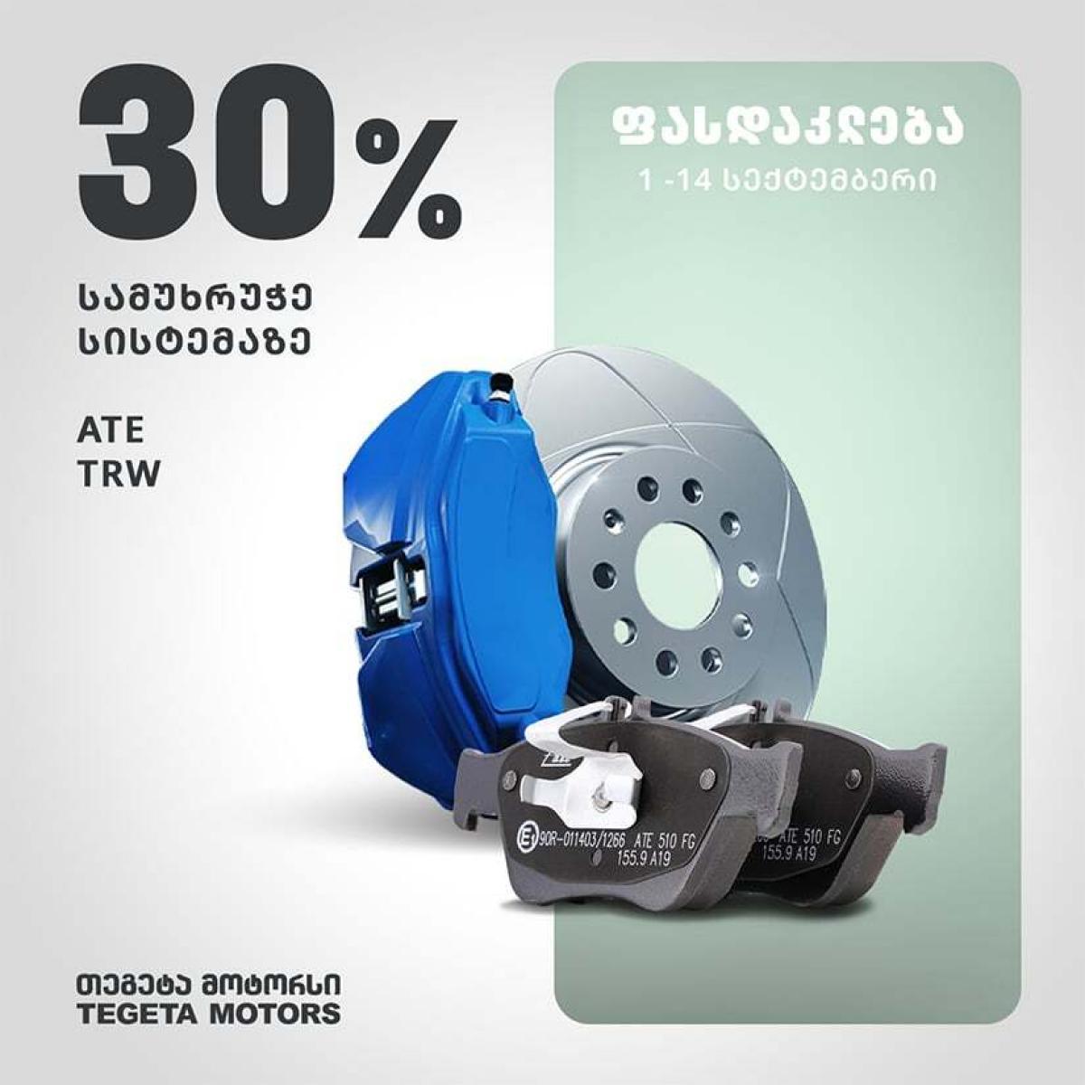 30%-იანი ფასდაკლება Ate-ს და TRW-ს სამუხრუჭე სისტემაზე წელიწადის ნებისმიერ დროს აუცილებელია ხუნდებისა და სამუხრუჭე სისტემის გამართულად მუშაობა. სამუხრუჭე სისტემის შემადგენელი ნაწილები, სამუხრუჭე დისკი და ხუნდი, ცვეთადი დეტალებია და დიდი მანძილის გავლის შემდეგ აუცილებელია მათი ჩანაცვლება ახალი დეტალებით. ზაფხულის მოგზაურობისა და სხვადასხვა სირთულის გზების გადალახვის შემდეგ სამუხრუჭე სისტემის ცვეთის დონე იზრდება. შესაბამისად, მოგზაურობის დასრულების შემდეგ, აუცილებლად უნდა შემოწმდეს სამუხრუჭე სისტემა. საჭიროების შემთხვევაში კი ახლით უნდა ჩანაცვლდეს, რათა ჩვენი ყოველდღიური გადაადგილება კომფორტული და უსაფრთხო იყოს. 14 სექტემბრის ჩათვლით „თეგეტა მოტორსში“ შესაძლებელია ავტომობილისთვის Ate-ს და TRW-ს სამხრუჭე სისტემის 30%-იანი ფასდაკლებით შეძენა. საშემოდგომო შეთავაზებებთან ერთად, მძღოლებს 14 სექტემბრის ჩათვლით „თეგეტა მოტორსის“ ფილიალებში სერვისის სრულ ასორტიმენტზე შესაძლებლობა აქვთ 20%-იანი ფასდაკლებით ისარგებლონ, სადაც პროფესიონალი და სერტიფიცირებული მექანიკოსები იზრუნებენ მათ ავტომობილზე. მაქსიმალური კომფორტისთვის, შესაძლებელია Tegeta shop-ით სარგებლობა და სახლიდან გაუსვლელად სასურველი პროდუქციის შეძენა. 14 სექტემბრის ჩათვლით Tegeta shop-ზე 30%-იანი ფასდაკლება მოქმედებს როგორც ზაფხულისა და ყველა სეზონის საბურავებზე, ისე Shell-ის Motul-ის, Petronas-ისა და Mobil-ის ზეთებზე. ასევე 30%-იანი ფასდაკლებაა Varta-ს, Energizer-ისა და Exide-ის აკუმულატორებზე, Ate-სა და TRW-ს სამუხრუჭე სისტემის ნაწილებზე. __ თეგეტა მოტორსის შესახებ: თეგეტა ჰოლდინგში შემავალი კომპანია თეგეტა მოტორსი 1995 წლიდან ოპერირებს ბაზარზე მსუბუქი, სატვირთო და სპეციალური დანიშნულების სერვისის მიმართულებით. ავტოინდუსტრიის ლიდერი კომპანია მომხმარებელს ავტომომსახურების სრულ სპექტრს სთავაზობს, როგორც მსუბუქი და სატვირთო ავტომობილების, ისე ავტობუსებისა და მიკროავტობუსების, ასევე სპეციალური დანიშნულების ტექნიკის მიმართულებით. კომპანიას მთელი ქვეყნის მასშტაბით 28 ფილიალი აქვს, რომლებიც 500 000-მდე საცალო და 35 000-მდე კორპორაციულ მომხმარებელს ემსახურება. თეგეტა მოტორსი 300-მდე მსოფლიო ბრენდის წარმომადგენელია საქართველოში, მათ შორის არის Bridgestone, Michelin, Varta, Shell, Motul, Hengst და სხვა.
