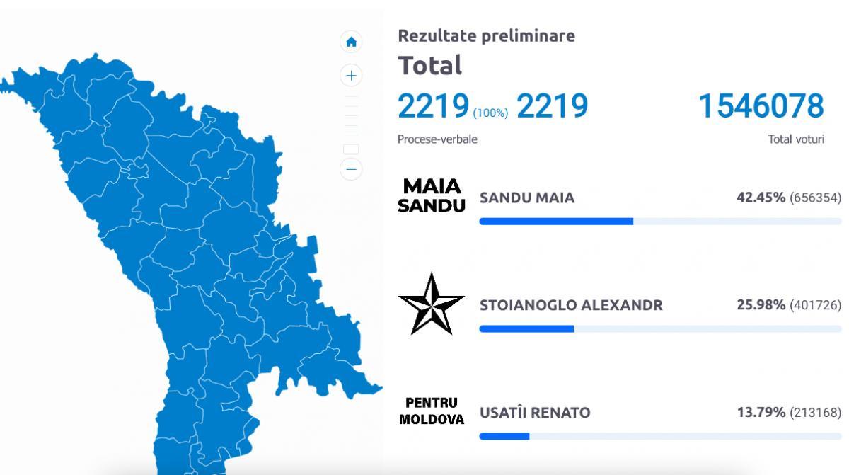 ამასთან ერთად, მოლდოვის ცენტრალურმა საარჩევნო კომისიამ საპრეზიდენტო არჩევნების ხმების 100% დაითვალა და ჯამში არჩევნებზე 1 456 457-მა ამომრჩეველმა მიიღო მონაწილეობა. შედეგების მიხედვით, მოქმედი პრეზიდენტი მაია სანდუ 42.45%-ით ლიდერობს, მისი კონკურენტი ალექსანდრე სტოლიანოგლო კი მეორე ადგილს 29,98%-ით იკავებს. 3 ნოემბერს ქვეყანაში საპრეზიდენტო არჩევნების მეორე ტური გაიმართება.