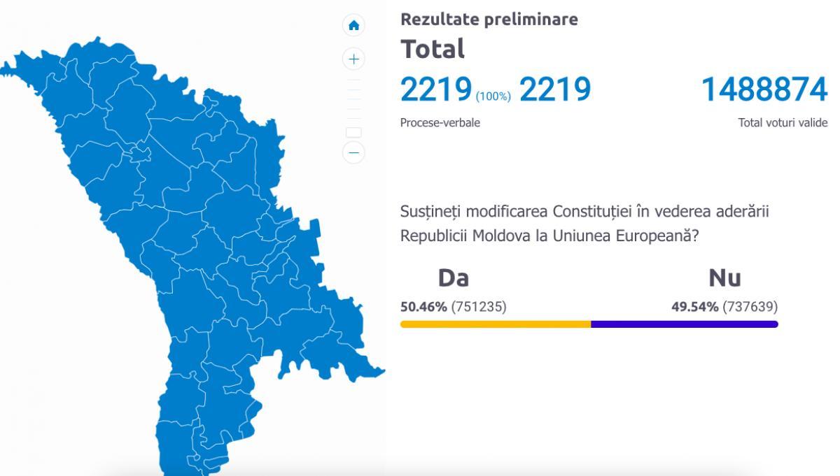 მოლდოვაში რეფერენდუმის შედეგების 100% დაითვალეს. აღნიშნულ ინფორმაციას მოლდოვის ცენტრალური საარჩევნო კომისია ავრცელებს. დათვლილი ხმების მიხედვით, საკონსტიტუციო რეფერენდუმში ამომრჩევლის 50,46%-მა კითხვას, "ემხრობა თუ არა კონსტიტუციის შეცვლას მოლდოვის რესპუბლიკის ევროკავშირში გაწევრიანების მიზნით?" დადებითი პასუხი გასცა.