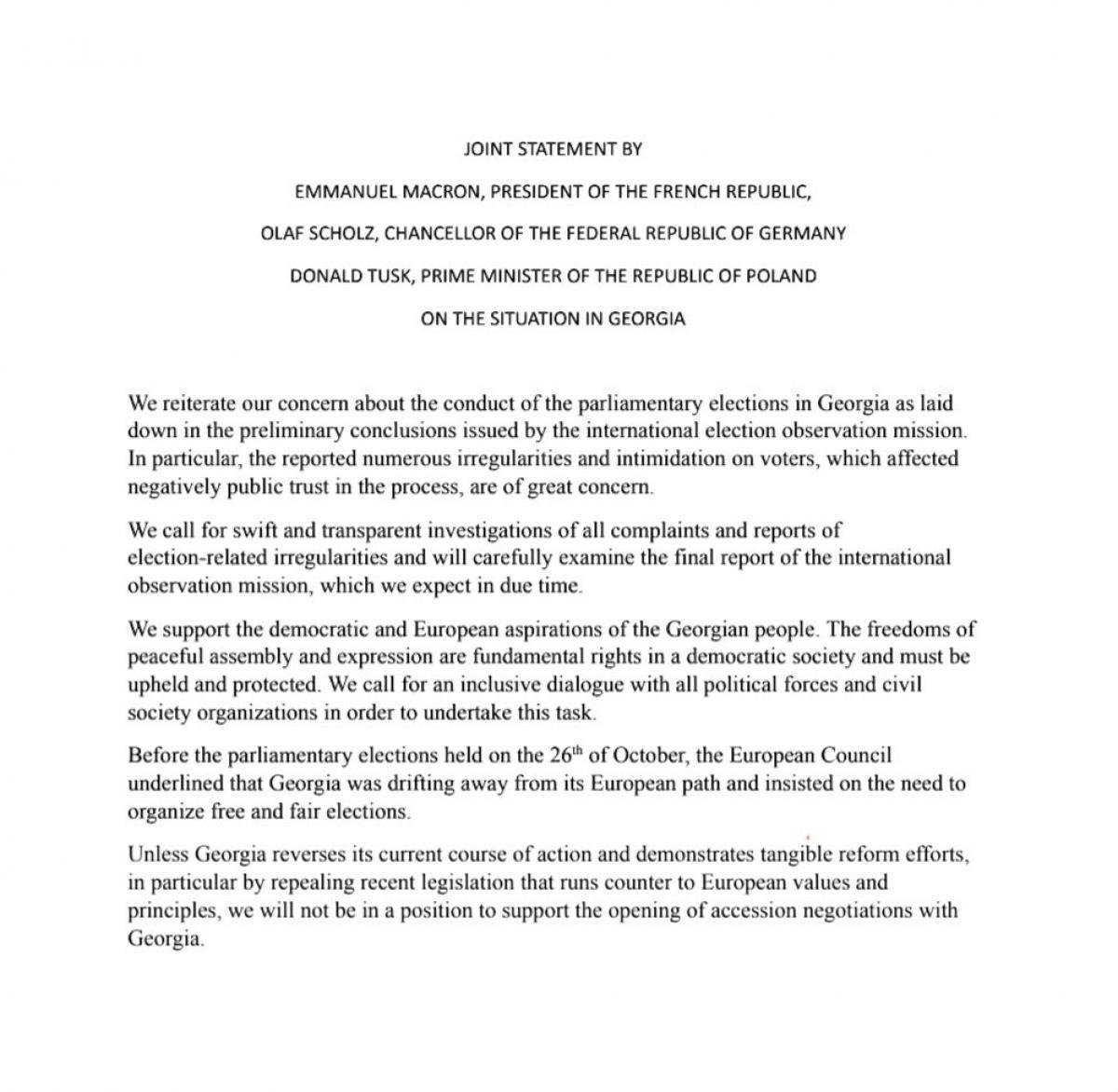 გერმანიის კანცლერი ოლაფ შოლცი, საფრანგეთის პრეზიდენტი ემანუელ მაკრონი და პოლონეთის პრემიერ-მინისტრი დონალდ ტუსკი ერთობლივ განცხადებას ავრცელებენ. როგორც ლიდერების ერთობლივ განცხადებაშია აღნიშნული, ისინი ქართველი ხალხის ევროპულ და დემოკრატიულ მისწრაფებებს მხარს უჭერენ, თუმცა საქართველოს ევროკავშირში გაწევრიანებაზე დიალოგის დაწყებას მხარს იქამდე ვერ დაუჭერენ, ვიდრე ქვეყანაში რეფორმები არ გატარდება.