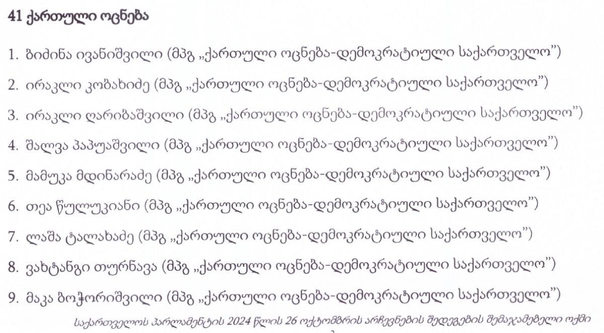 2024 წლის საპარლამენტო არჩევნების შემაჯამებელი ოქმის თანახმად, „ქართულმა ოცნებამ“ ამომრჩეველთა 53.93%-იანი მხარდაჭერა მიიღო და პარლამენტში 89 მანდატით იქნება წარმოდგენილი..