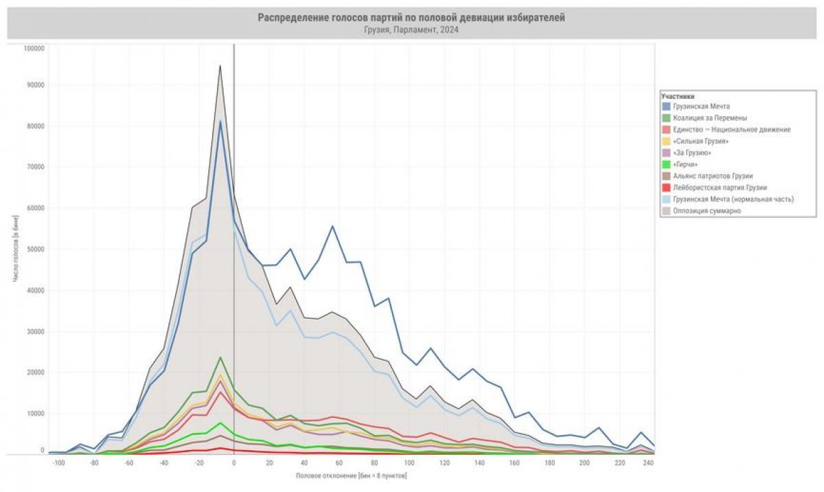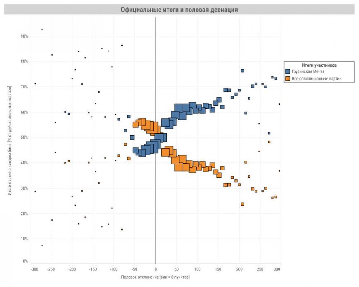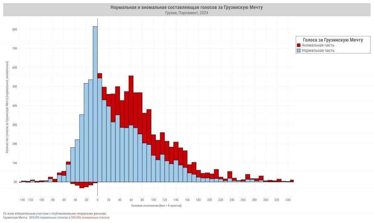 ჰორიზონტალურ ღერძზე არის „გენდერული გადახრა“ ცვლადი (სხვაობა მამაკაცთა აქტივობას შორის და ქალთა აქტივობას შორის გაყოფილი მათი ჯამით), ღერძი დაყოფილია 8 პუნქტიან ურნებში, ვერტიკალური ღერძის გასწვრივ არის ხმების რაოდენობა ურნა. დიაგრამის მარცხენა და ცენტრალური ნაწილები აჩვენებს, რომ პარტიები ერთნაირად იქცევიან საარჩევნო უბნებზე გამოცხადებულ მამაკაცთა და ქალთა რაოდენობის განსხვავებასთან დაკავშირებით. მართლაც, გამოკითხვებმა, რომლებშიც დაფიქსირდა რესპონდენტის სქესი, ეკუთვნოდა თუ არა ის სოფელს თუ ქალაქს, დედაქალაქს თუ პროვინციას, არ გამოავლინა რაიმე მნიშვნელოვანი განსხვავება ქალისა და მამაკაცის მხრიდან იმის თაობაზე, მიდის თუ არა საქართველო სწორი თუ არასწორი მიმართულება." ორივე მამაკაცის 39%-მა და ქალების 39%-მა მიიჩნია მიმართულება სწორი. დაახლოებით ამდენივე ამომრჩეველმა დაუჭირა მხარი „ქართულ ოცნებას“, თუმცა გარკვეული დონიდან დაწყებული (დაახლოებით 20 ქულის გადახრა მამაკაცების სასარგებლოდ) ირღვევა მოსალოდნელი ჰარმონია. აქ არის ანალოგია რუსეთის გაყალბებასთან: იგივე ხდება საარჩევნო მკვლევარის სერგეი შპილკინის გრაფიკებში, როდესაც საეჭვოდ აქტიური ამომრჩევლის ზონაში შევდივართ. მხოლოდ საქართველოშია ეს ჰიპერაქტიური მამრობითი ამომრჩევლის ზონა. წინააღმდეგ შემთხვევაში, გრაფიკები ისეთივე მსგავსია, როგორც ორი ბარდა ტოტში - განსაკუთრებით საშუალო დონის გაყალბებისთვის, როგორიცაა 2018 წლის რუსეთის საპრეზიდენტო არჩევნები. ანალოგიური ანალიზის გამოყენებით, ჩვენ ვანაწილებთ მანიპულაციის სავარაუდო ბენეფიციარის შედეგებს ნორმალურ და არანორმალურ ნაწილებად. ნორმალური ნაწილი რჩება პირობითად "პატიოსანი" მონაწილეების შედეგების პროპორციული. შპილკინის მიერ შემოტანილი ტრადიციის მიხედვით, დარჩენილ ნაწილს პოლიტიკურად კორექტულს დავარქმევთ „ანომალიურ ხმებს“. მოდით მოვაწყოთ ყველა საარჩევნო უბანი „ყუთებად“ მნიშვნელობების მოცემული ინტერვალით „სექსუალური გადახრის“ ცვლადი, რომელიც ახასიათებს გენდერულ დისბალანსს. დავთვალოთ რამდენი ხმა ჩავარდა „ქართულ ოცნებას“ და რამდენი ოპოზიციურ პარტიას თითოეულ „ყუთში“ - ურნაში. მოდით შევაფასოთ თანაფარდობა ძალაუფლებასა და ოპოზიციას შორის ნეგატიური და ნულოვანი გენდერული გადახრებისთვის (ანუ როცა ქალები უფრო აქტიურები არიან ან როცა ყველა დაახლოებით თანაბრად აქტიურია). იმის გათვალისწინებით, რომ პროპორციულობა ხელისუფლებასა და ოპოზიციას შორის მაღალი პოზიტიური სექსუალური გადახრებითაც უნდა შენა