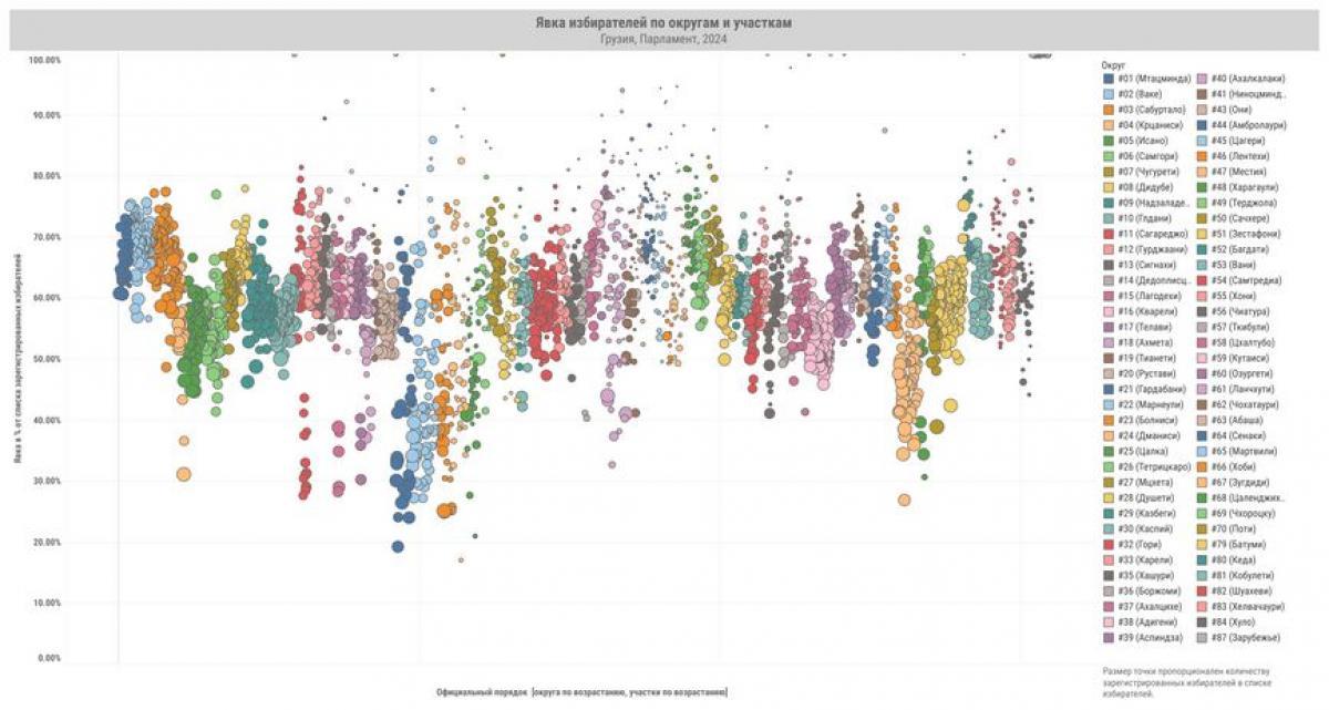 ჰორიზონტალური ღერძი გვიჩვენებს საოლქო საარჩევნო კომისიების და უბნების რაოდენობას ზრდადი თანმიმდევრობით, ხოლო ვერტიკალური ღერძი - ქართული ოცნების (ზედა გრაფიკი) და აქტივობის (ქვედა გრაფიკი) შედეგებს. ამის შესახებ 28 ოქტომბერს გამართულ ბრიფინგზე ჩემი ხმის პროექტის წარმომადგენელმა ლონდა თოლორაიამ განაცხადა: „ეს ფალსიფიკაციის სქემა არ იწვევს დისბალანსს, რომელიც დამახასიათებელია სხვა კარუსელებისთვის“. ანუ, მათემატიკურად, ეს ჰგავს ბიულეტენების გადატანას დასტიდან დასტაზე და არ ჩაყრიან მათ, ისინი უბრალოდ ცოცხალ ადამიანებს „გადაინაცვლებენ“ და არა ქაღალდის ნაჭრებს. შეიძლება ყველაფერი უფრო მარტივი იყოს? ხმების მასობრივი ყიდვა არის მასიური დანაშაული, განსხვავებით „პასპორტის დაქირავებისგან“, ხშირად შეღავათებზე განაცხადის საფარქვეშ. ეს იმიტომ მოხდა, რომ საუბნო საარჩევნო კომისიებში ჯერ კიდევ არის ძალიან ბევრი ოპოზიციის წარმომადგენელი, რომლებიც ვერ „დასდებენ ბრალს“ და ვინც აშკარა და აშკარა ჩაყრას დაინახავდა, მაგრამ უძლური აღმოჩნდა მმართველი პარტიის შეთანხმების ფონზე. "მოკავშირე რეგისტრატორები", როგორც აღწერილია მოძრაობის მოხსენებაში "ჩემი ხმა". რუსული ტრადიციისგან განსხვავებით, ღამით შედეგების უბრალოდ „გადახაზვა“ შეუძლებელია. დასრულების შემდეგ, პროტოკოლების ასლები დაუყოვნებლივ განთავსდება ინტერნეტში და რჩება იქ დღემდე ორიგინალური სახით. რამდენი ხმა ჩააგდეს და როგორი იყო რეალური შედეგი?