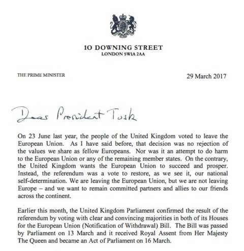 ევროკავშირის საბჭოს დონალდ ტუსკის ინფორმაციით, დიდი ბრიტანეთის ევროკავშირიდან გამოსვლის პროცედურა ამოქმედდა, - ამის შესახებ BBC იუწყება. ევროკავშირში ბრიტანეთის ელჩმა ტიმ ბაროუმ დონალდ ტუსკს ქვეყნის პრემიერ-მინისტრის ტერეზა მეის მიერ მოწერილი წერილი უკვე გადასცა. ქვეყნის პრემიერი "ბრექსითის" დაწყებასთან დაკავშირებით, ლისაბონის შეთანხმების 50-ე მუხლი გამოიყენა. საბუთი აძლევს საშუალებას (თუმცა არ ავალდებულებს) პრემიერ-მინისტრს აცნობოს ევროკავშირის წევრებს, რომ დიდი ბრიტანეთი "ბრექსითის" 2-წლიან პროცედურას იწყებს. რას გულისხმობს ლისაბონის შეთანხმების 50-ე მუხლი - 2007 წელს ხელი მოეწერა საბუთს, რომელიც ევროპული კავშირის შეთანხმებას გულისხმობს. ის ცნობილია, როგორც ლისაბონის შეთანხმება. ლისაბონის შეთანხმებამ ევროკავშირის კონსტიტუცია ჩაანაცვლა, რომლის წინააღმდეგ ორი წევრი ქვეყანა - საფრანგეთი და ნიდერლანდები გამოდიოდნენ. ლისაბონის შეთანხმება არის ევროკავშირის ძირითადი საბუთი, რომლის თანახმადაც წევრ ქვეყანას აქვს უფლება კავშირი დატოვოს. სწორედ ამას ეძღვნება 50-ე მუხლი. "ეს ისტორიული მომენტია, რომლის დაწყებითაც უკან დასაბრუნებელი გზა არ გვექნება. ბრიტანეთი ევროკავშირს ტოვებს - ჩვენ მივირებთ გადაწყვეტილებებს და ჩვენ პირად კანონებს. კონტროლის ქვეშ იქნება ყველაფერი, რაც ჩვენთვის მნიშვნელოვანია. გამოვიყენებთ შესაძლებლობას, ავაშენოთ უფრო პატიოსანი ბრუტანეთი, რომლითაც ჩვენი შვილები იამაყებენ", - განაცხადა პრემიერ-მინისტრმა ტერეზა მეიმ. უკვე გამოქვეყნდა დიდი ბრიტანეთის პრემიერ-მინისტრის ტერეზა მეის წერილი, ევროკავშირის საბჭოს პრეზიდენტის დონალდ ტუსკის სახელზე: