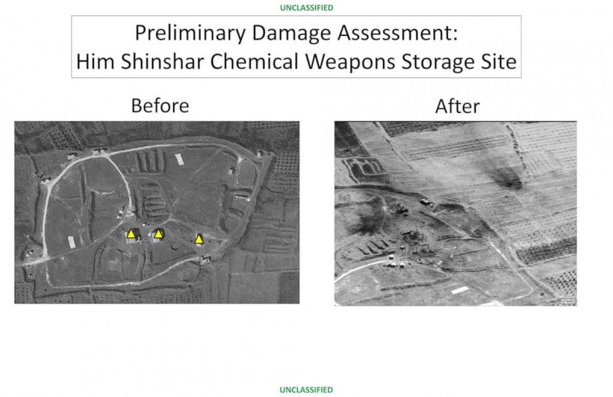 პენტაგონმა სირიაზე მიტანილი იერიშების ამსახველი ფოტო და ვიდეომასალა გამოაქვეყნა. მასალაში ის ობიექტები ჩანს, რომელზეც დასავლეთის კოალიციამ საჰაერო იერიში მიიტანა. მათ შორის არის კვლევითი ცენტრი, სადაც ქიმიურ იარაღს აწარმოებდნენ, ასევე ამ იარაღის საცავი და ბუნკერი. ფოტოებზე ნაჩვენებია, თუ როგორ გამოიყურებოდა შენობები მანამდე და სარაკეტო დარტყმების შემდეგ. სირიაში განხორციელებული იერიშის შედეგების ამსახველი სატელიტით გადაღებული ფოტოები გაავრცელა Washington Post-მა და Fox News-მა. როგორც პენტაგონში განაცხადეს, სირიის მიმართულებით 100-ზე მეტი რაკეტა გაუშვეს, რომელთა უმრავლესობამ სამიზნე გაანადგურა.
