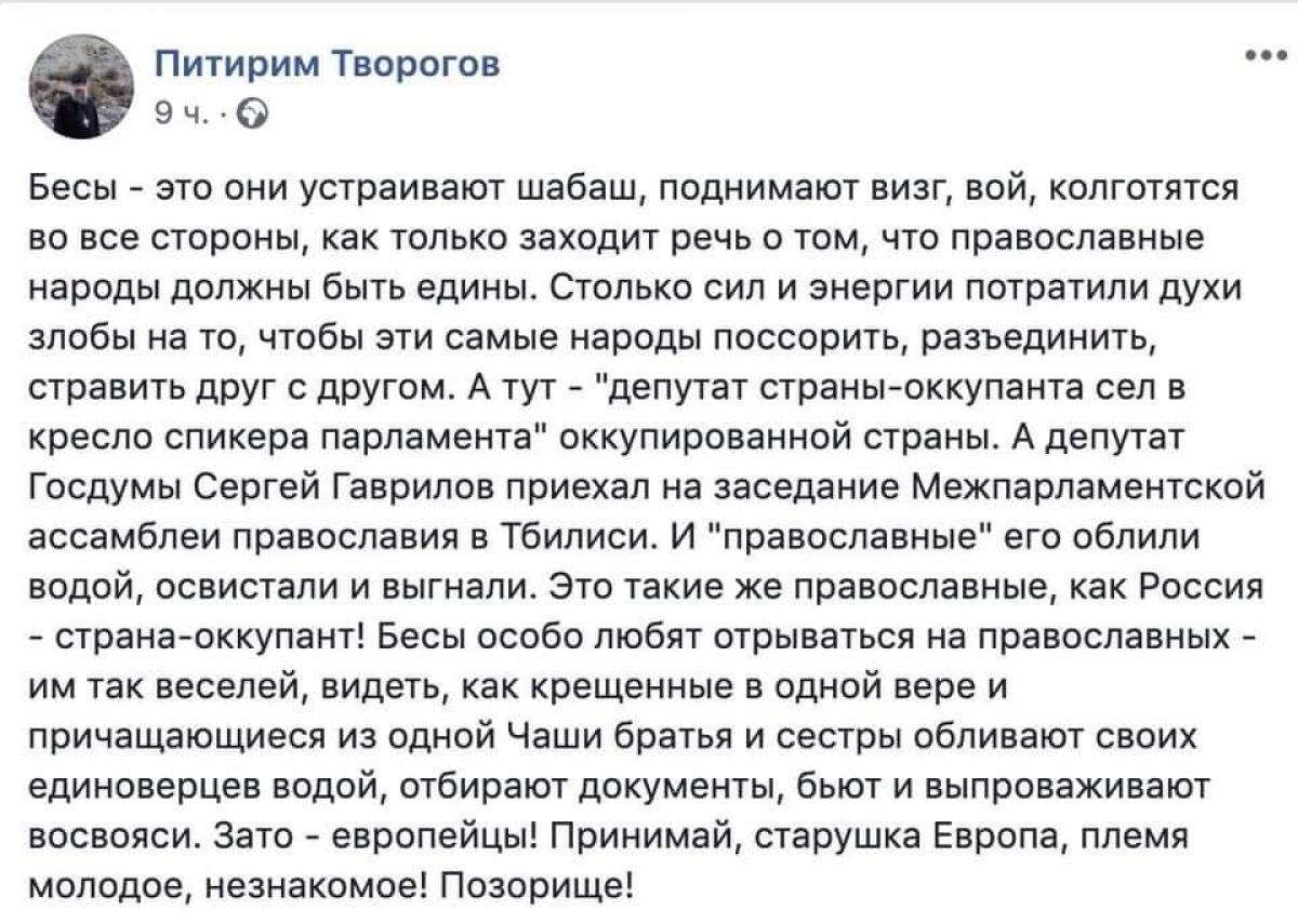რუსეთის ეკლესიის ეპისკოპოსმა პეტირიმ ტვოროგვმა საქართველოს მოსახლეობა დემონებს შეადარა. ამით ის თბილისში რუსი დეპუტატის ვიტის გარშემო განვიტარებულ მოვლენებს გამოეხმაურა. "ე.წ მართლმადიდებლებმა სერგეი გავრილოვს წყალი შეასხეს და შეძახილებით გააძევეს ქვეყნიდან. ისინი ისეთივე მართლმადიდებლები არიან, როგორც რუსეთი არის ოკუპანტი ქვეყანა. დემონებს ასე უყვართ გართობა, მათ სიამოვნებთ იმის ყურება თუ როგორ ებრძვიან ერთმანეთს მართლმადებელი ძმები და დები, როგორ ასხავენ ერთმანეთს წყალს, ართმევენ საბუთებს, სცემენ და აძევებენ ქვეყნიდან. სამაგიეროდ ევროპელები - მიიღე ევროპავ ახალი ახალგაზრდა, უცნობი თემი! სირცხვილი!", - წერს ეპისკოპოსი Facebook-ის საკუთარ გვერდზე.