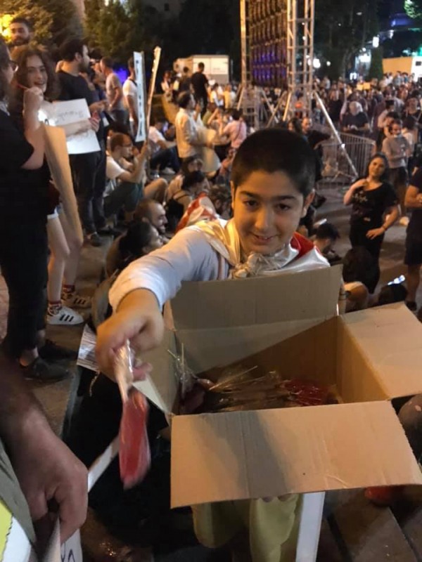 12 წლის გიორგი პარლამენტის წინ აქციის მონაწილეებს თავის დამზადებულ მამალოებს ურიგებს