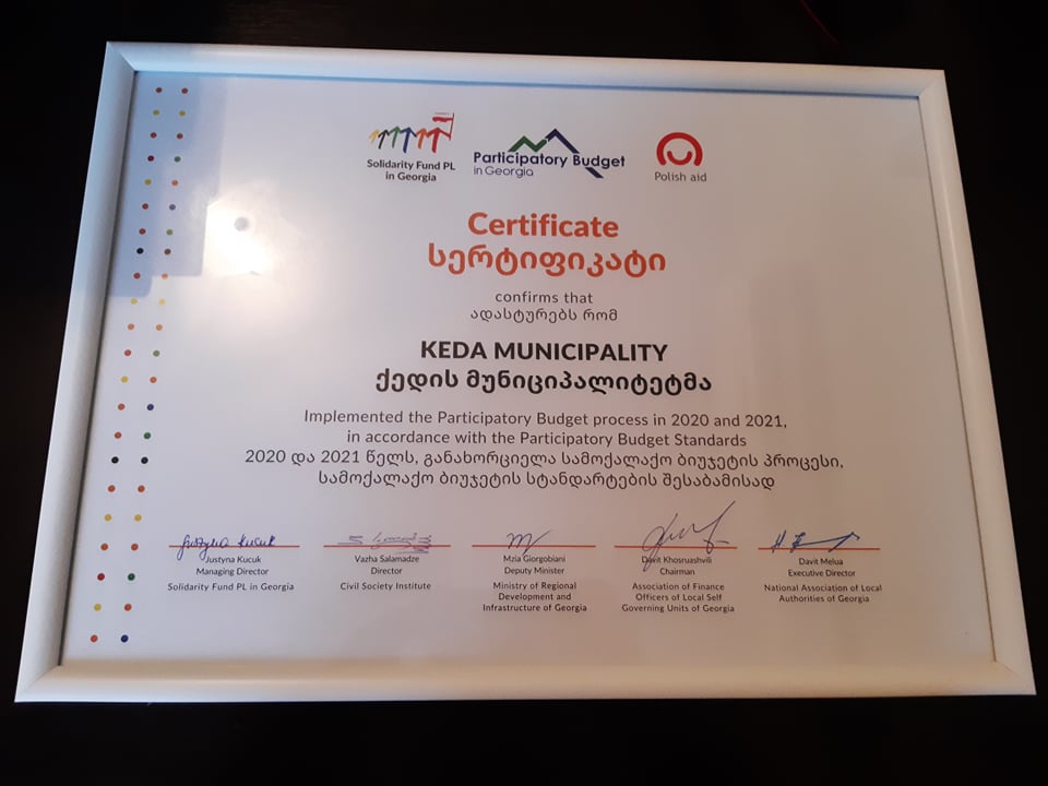 ქედის მუნიციპალიტეტმა 2020–21 წელს სამოქალაქო ბიუჯეტის სამოქალაქო სტანდარტების შესაბამისად განხორციელებისთვის სიგელი მიიღო
