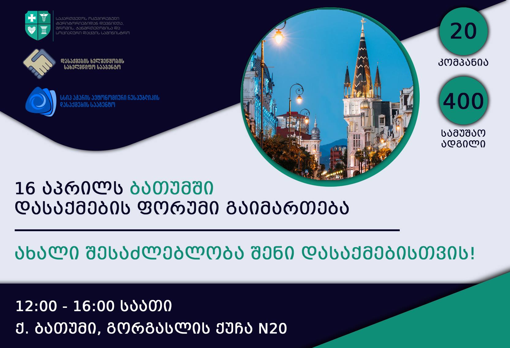 ბათუმში, პიაცას მოედანზე დასაქმების ფორუმი სახელწოდებით - „ახალი შესაძლებლობა თქვენი დასაქმებისთვის“ გაიმართება